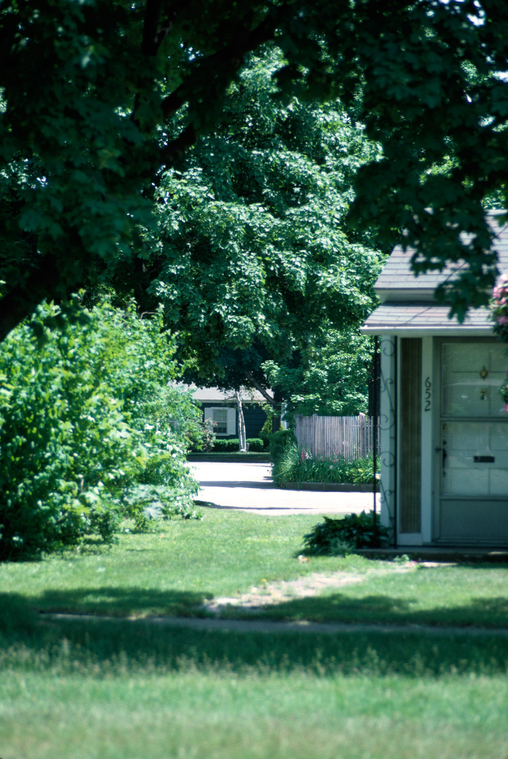 Veterans' housing in campus-like plan with internal walks; included school, commercial and recreational facilities. general view, view between the corner of a house and a shrub to a road and houses behind, 1987