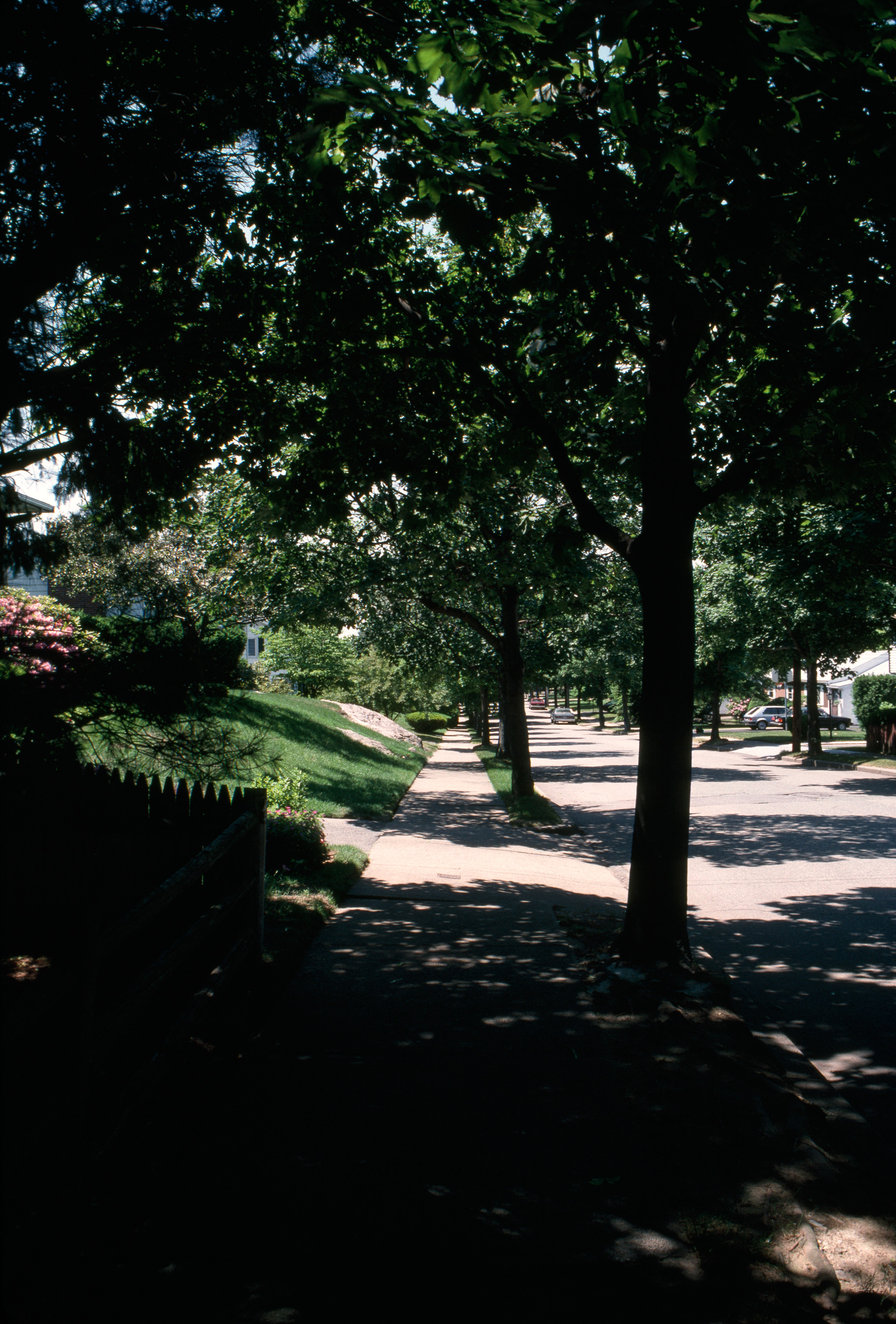 Veterans' housing in campus-like plan with internal walks; included school, commercial and recreational facilities. general view, shady sidewalk with houses on a hill to one side, 1987