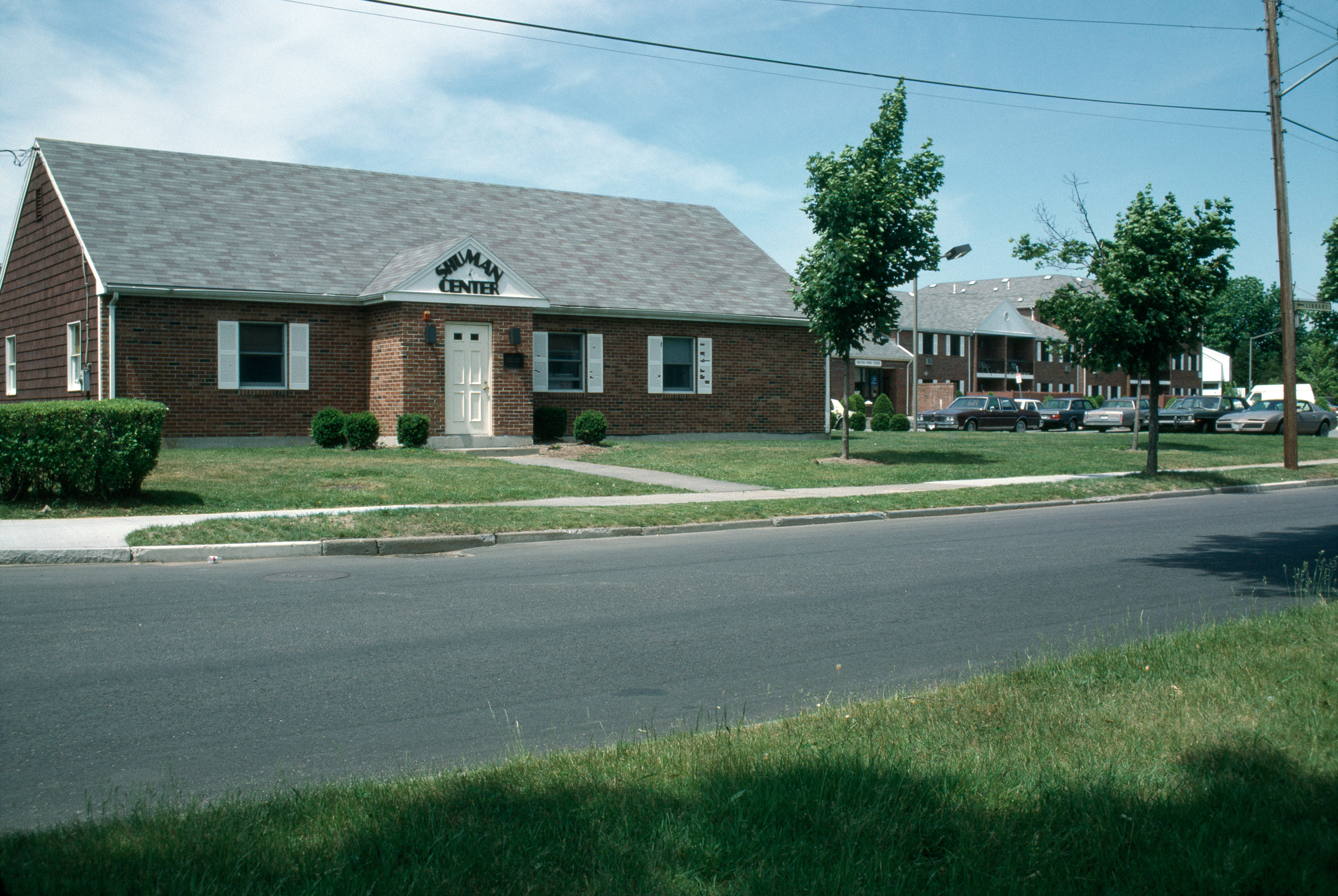 Veterans' housing in campus-like plan with internal walks; included school, commercial and recreational facilities. general view, Robert L. Shuman Community Center, seen from across the street, 1987
