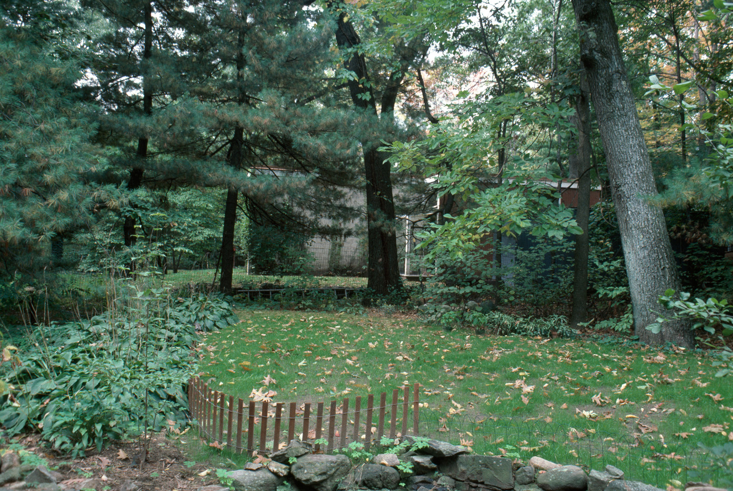 Cooperative community with common land and pool, sited to emphasize sylvan character; architectural design control. general view, grassy area near woods in front of a house, 1987