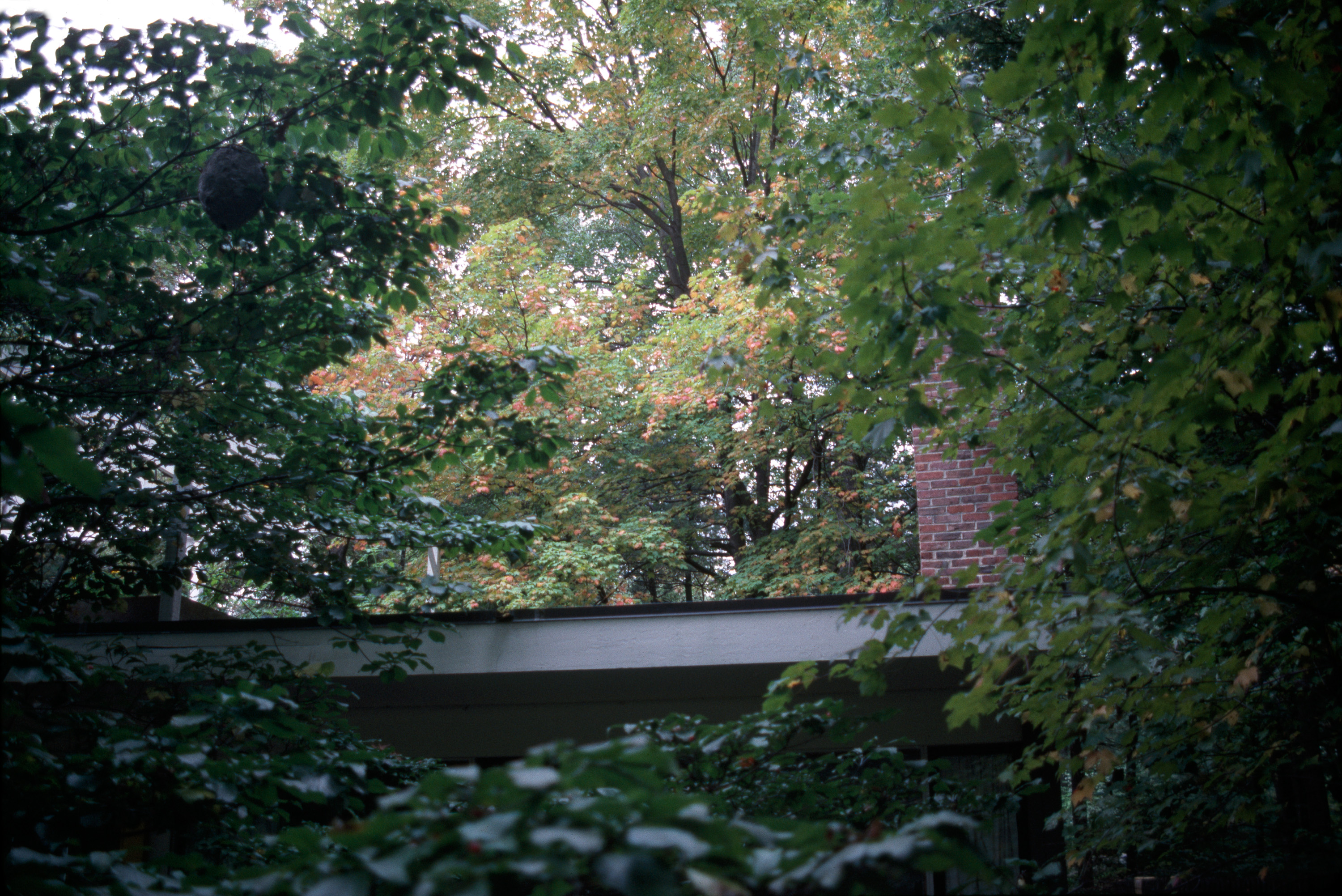Cooperative community with common land and pool, sited to emphasize sylvan character; architectural design control. general view, flat roof's edge and overhang surrounded by trees, 1987