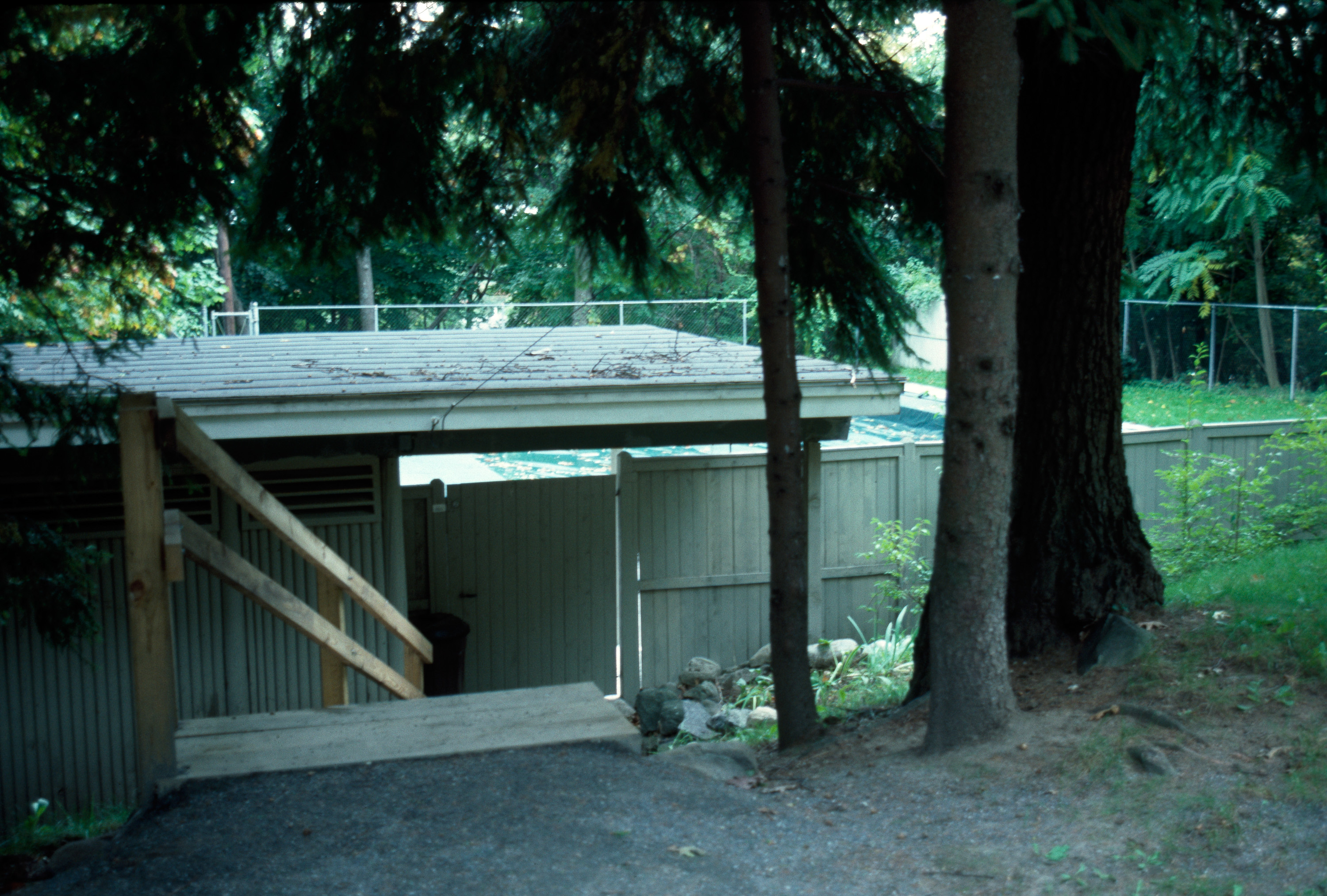 Cooperative community with common land and pool, sited to emphasize sylvan character; architectural design control. general view, cabana, fence and covered swimming pool, 1987