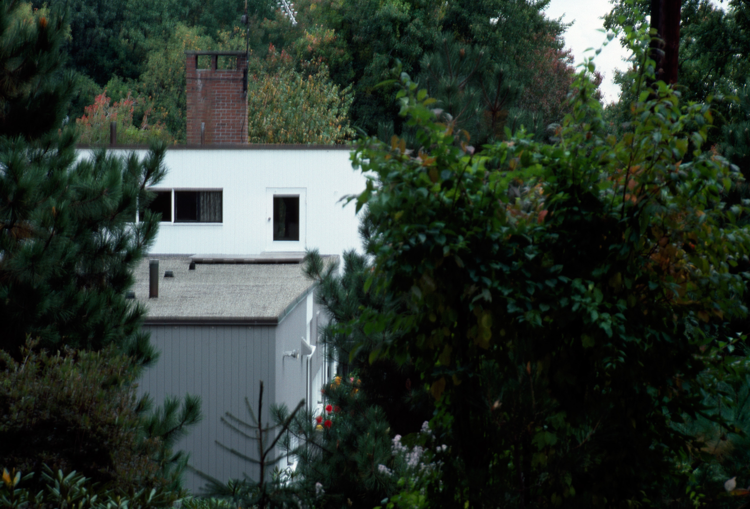 Cooperative community with common land and pool, sited to emphasize sylvan character; architectural design control. general view, house seen through trees, 1987