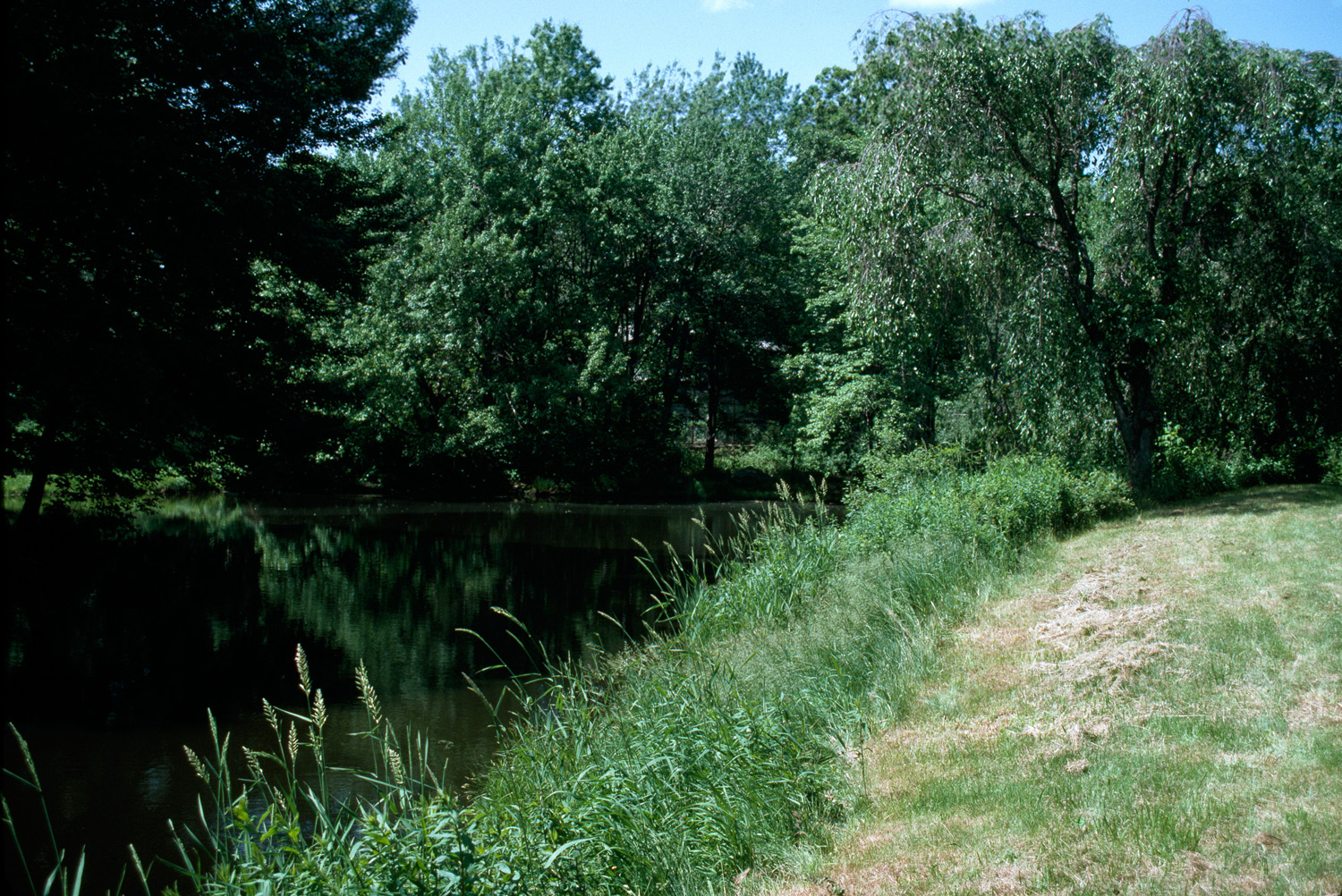 Commercial version of Six Moon Hill, featuring common land and adaptable basic house designs. general view, edge of pond surrounded by grass, 1987