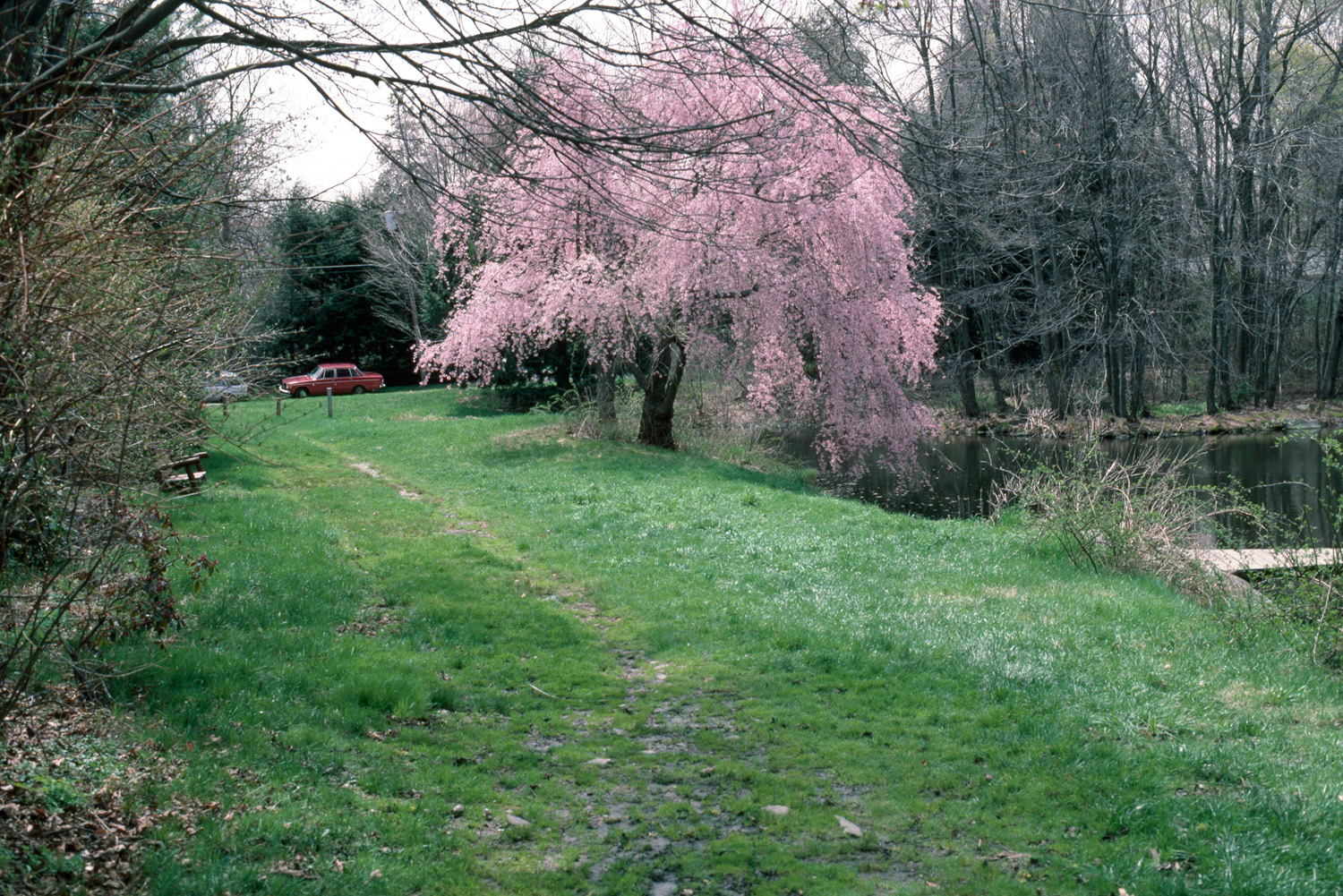 Commercial version of Six Moon Hill, featuring common land and adaptable basic house designs. general view, path next to a pond and flowering tree, 1987