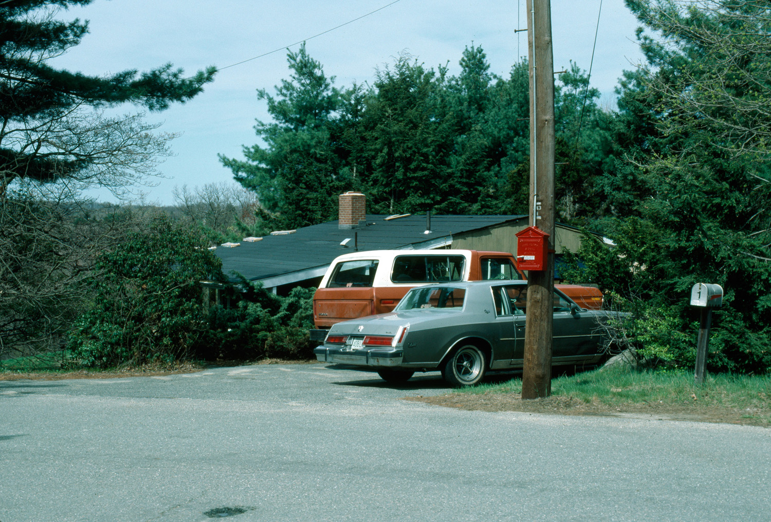 Commercial version of Six Moon Hill, featuring common land and adaptable basic house designs. general view, Field Road, driveway, mailbox and a fire alarm box , 1987