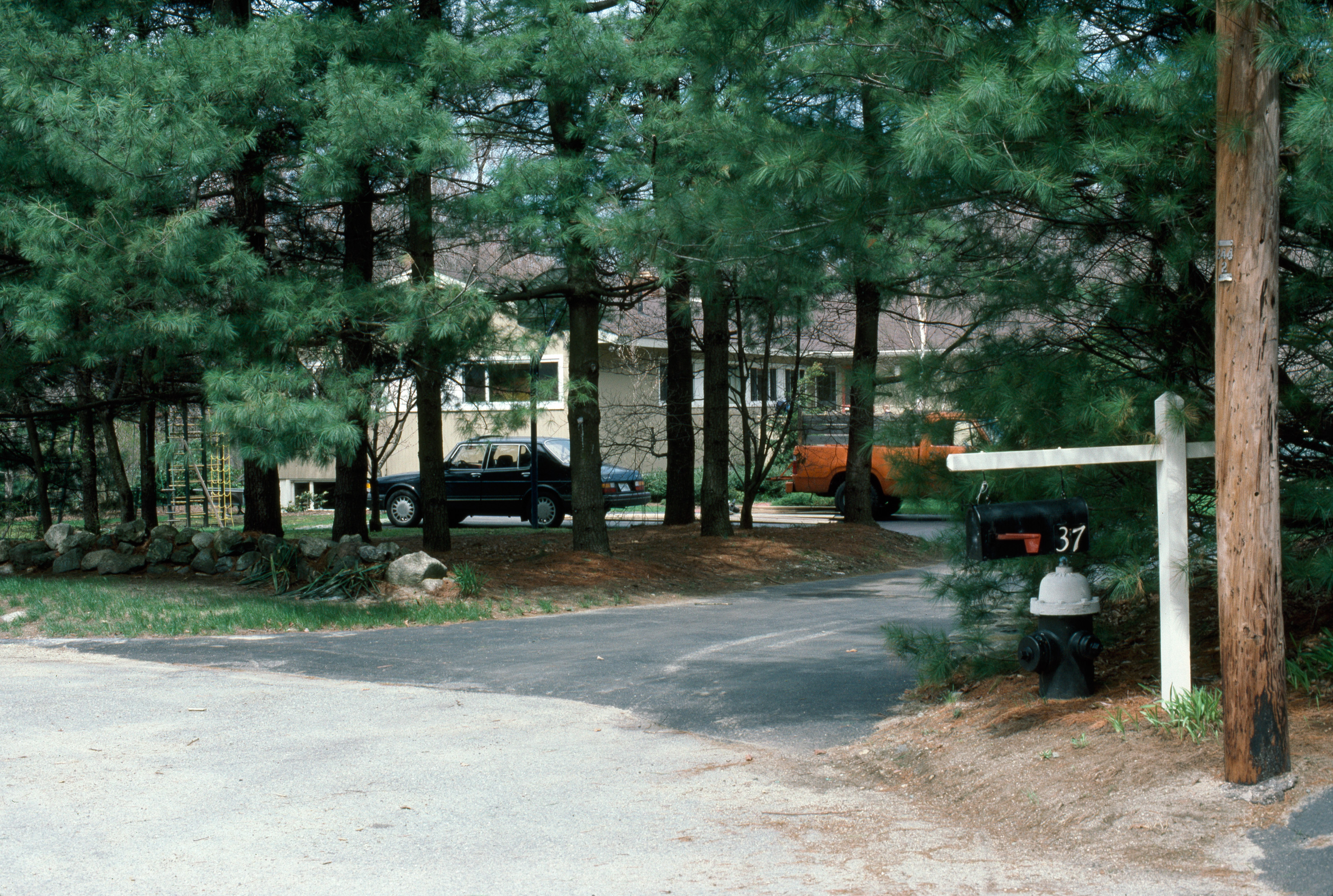 Commercial version of Six Moon Hill, featuring common land and adaptable basic house designs. general view, mailbox on a cul-de-sac, vehicles and house behind trees, 1987