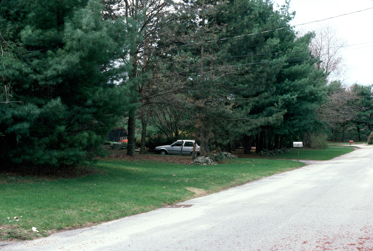 Commercial version of Six Moon Hill, featuring common land and adaptable  basic house designs. general view, car parked in driveway behind stone wall, 1987