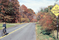 Replicable split-level house adaptable for hillside siting; featured common land and recreational facilities; architectural design restrictions. general view, road in wooded area, with child on bicycle and sign, 1971