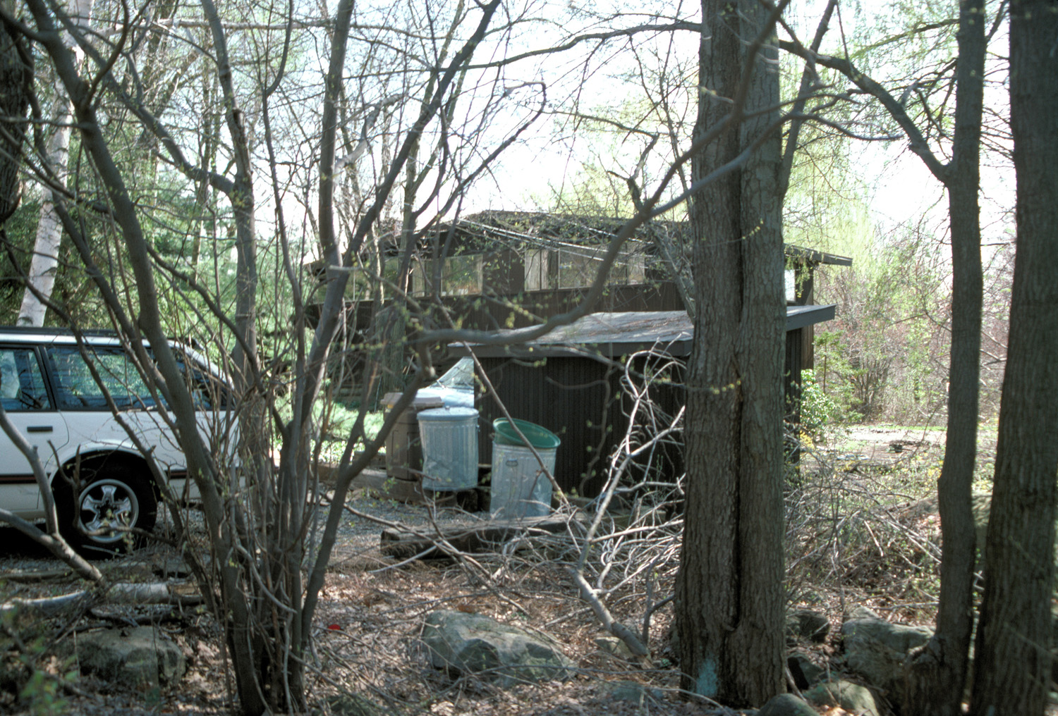 Replicable split-level house adaptable for hillside siting; featured common land and recreational facilities; architectural design restrictions. general view, car in driveway, shed, and house, obscured by trees and vegetation, 1987