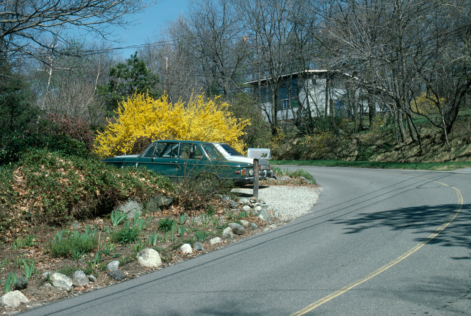 Replicable split-level house adaptable for hillside siting; featured common land and recreational facilities; architectural design restrictions. general view, two-lane blacktop road, with driveway and parked cars, and house, 1987