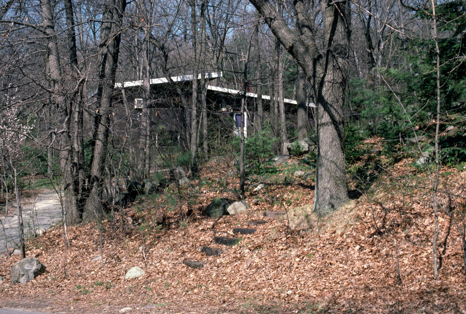 Replicable split-level house adaptable for hillside siting; featured common land and recreational facilities; architectural design restrictions. general view, house partially obscured by trees, 1987