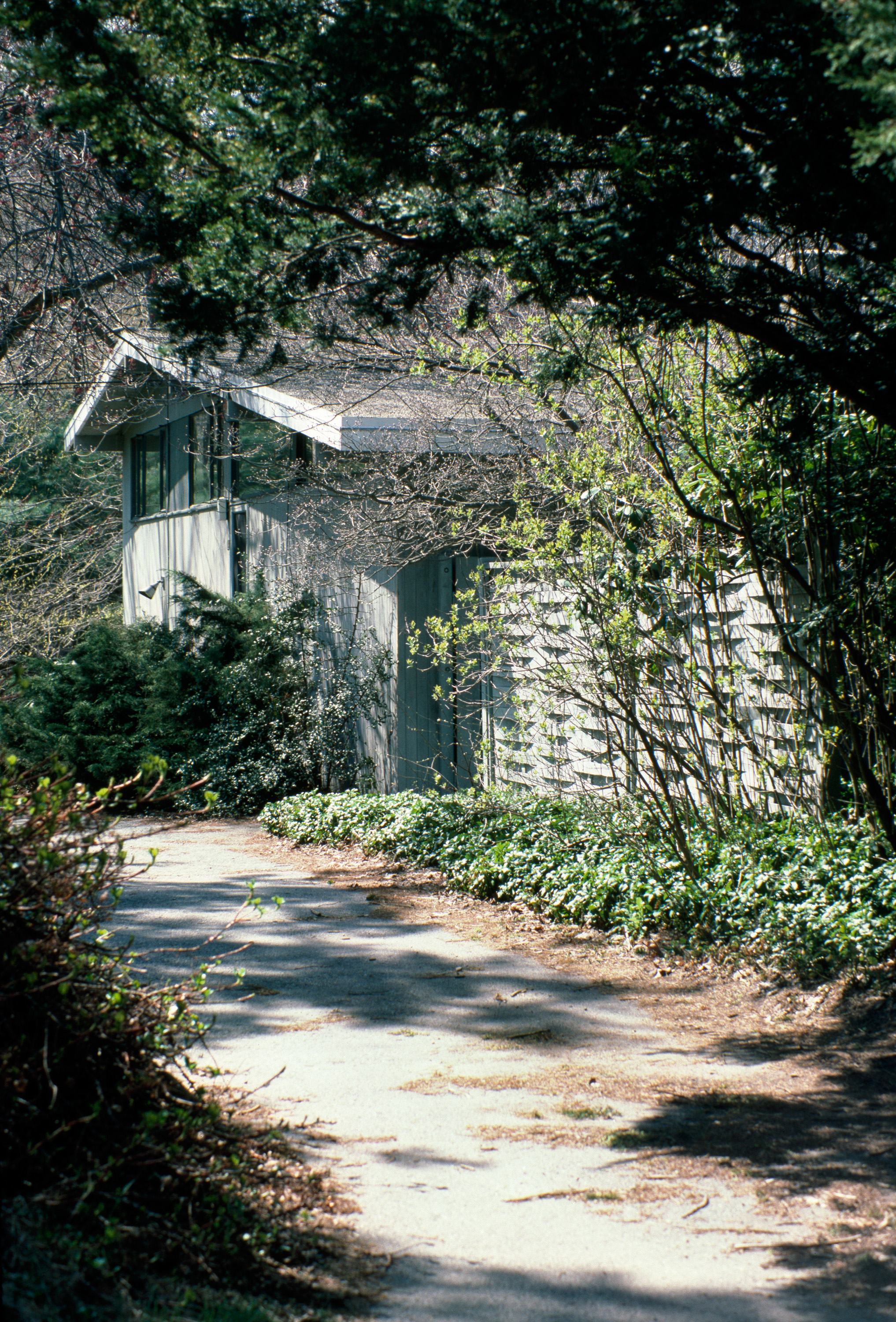 Replicable split-level house adaptable for hillside siting; featured common land and recreational facilities; architectural design restrictions. general view, driveway alongside house, 1987