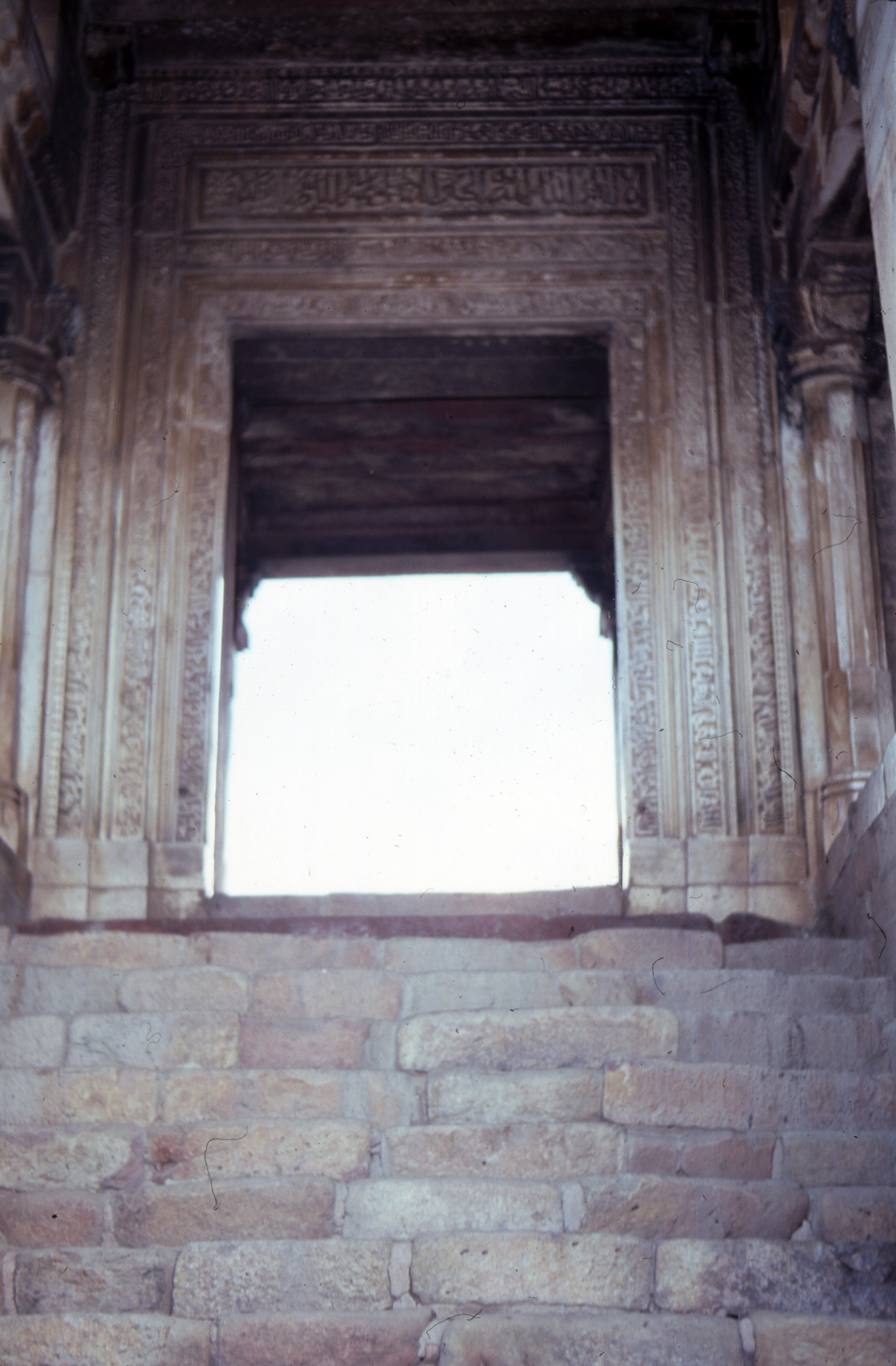 exterior, detail of stairs and carved marble entrance to tomb enclosure, 1982