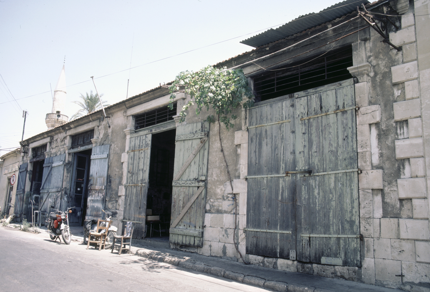 general view, view looking north on Bazaar Street, facades of Ottoman-era buildings; minaret of Cami-i Kebir visible above, 1985