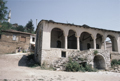 exterior, view to western corner, with porch; minaret from the Mosque of Aslan Pasha visible in background, 1985