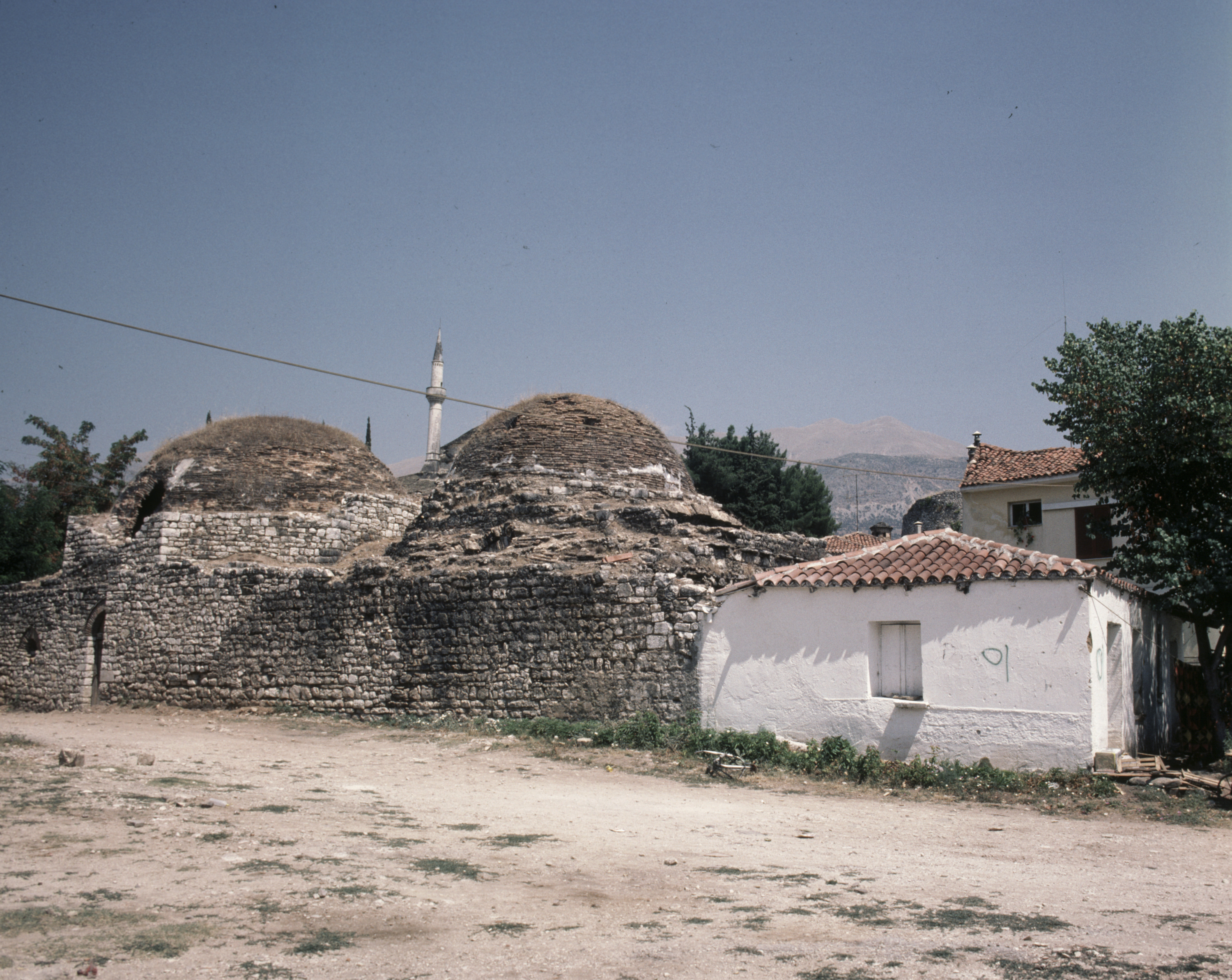 exterior, overall view of western facade of baths, with minaret of Aslan Pasha Mosque in background, 1985