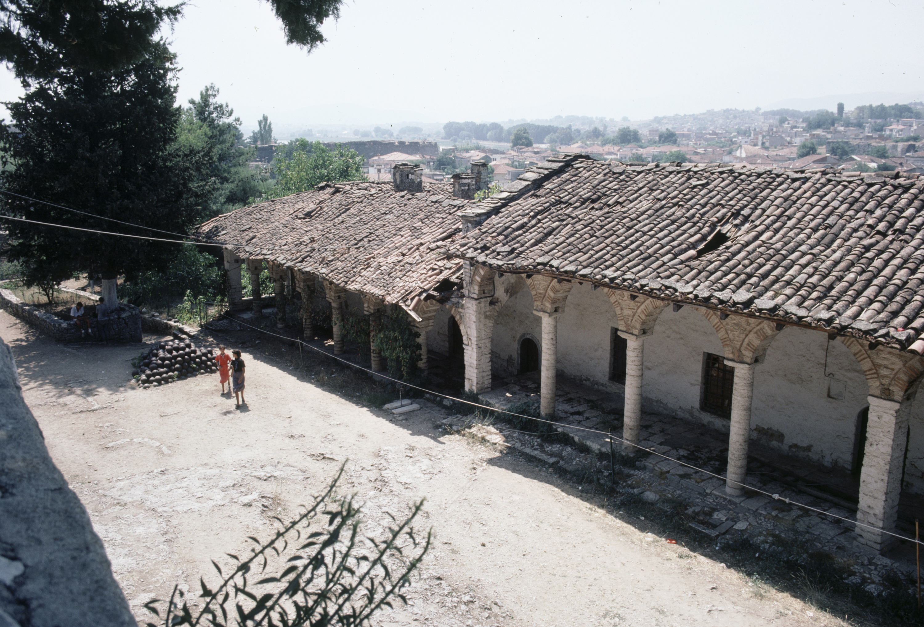 exterior, elevated view of madrasa, seen from the minaret of Aslan Pasha Mosque, 1985