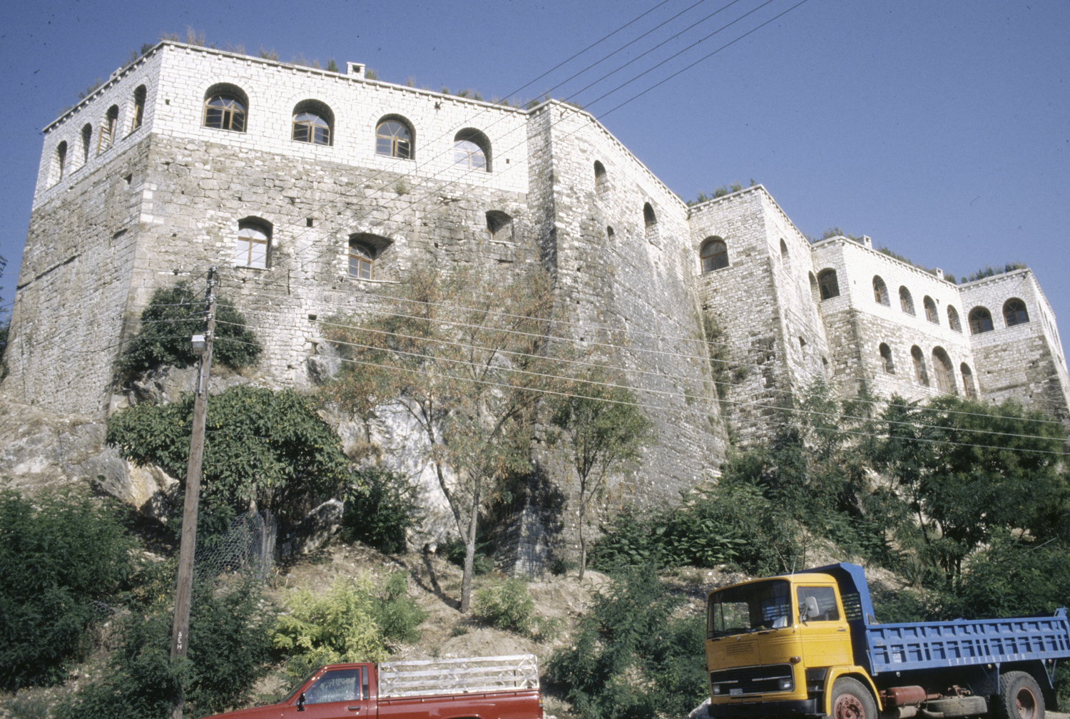 exterior, view from below of fortress on hilltop, with restored upper story, 1985