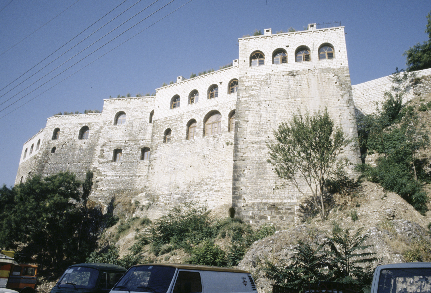 exterior, view from below of fortress on hilltop, with restored upper story, 1985
