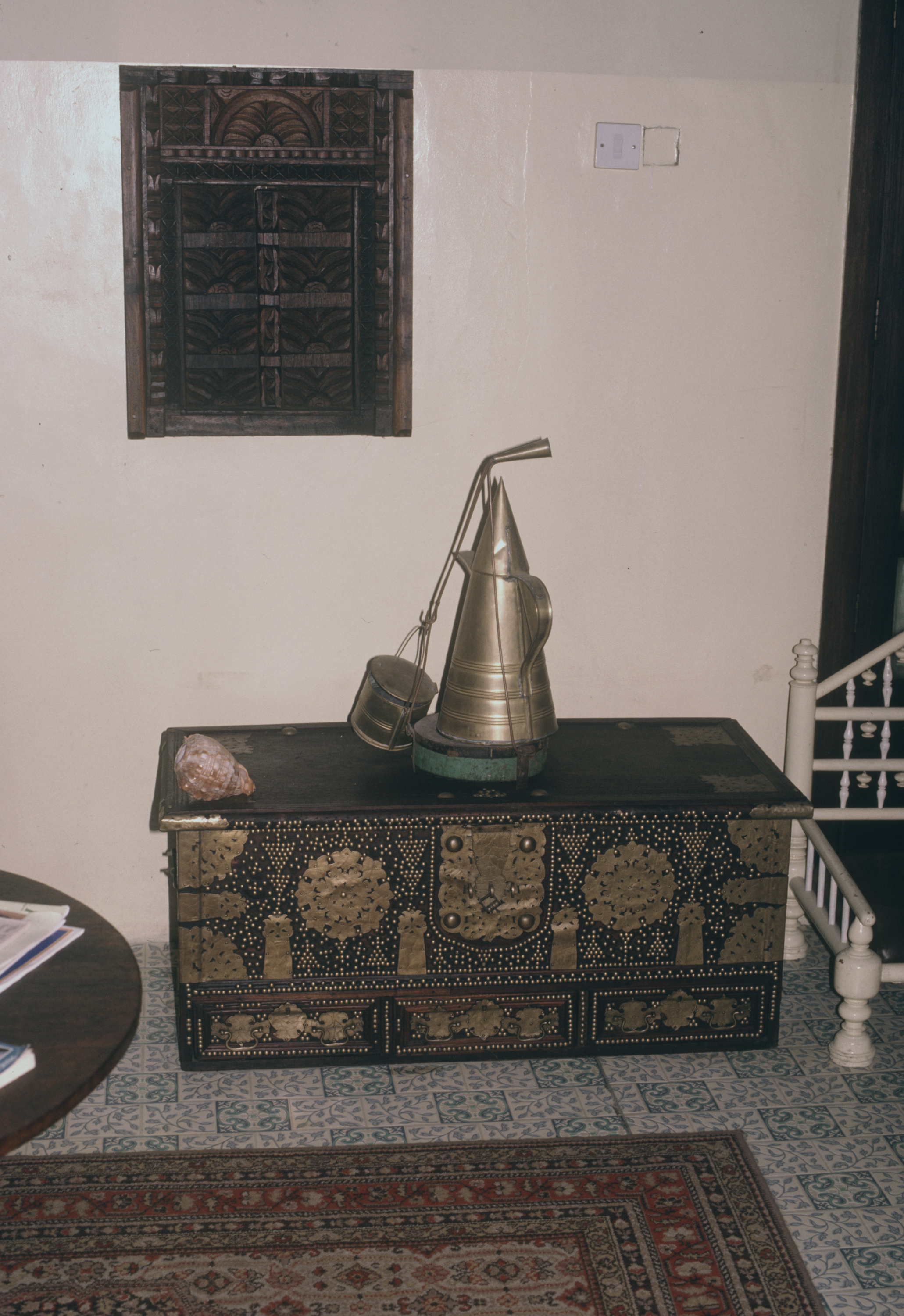 interior, detail of furnishings: brass-studded Zanzibar trunk, with coffee pot, 1985