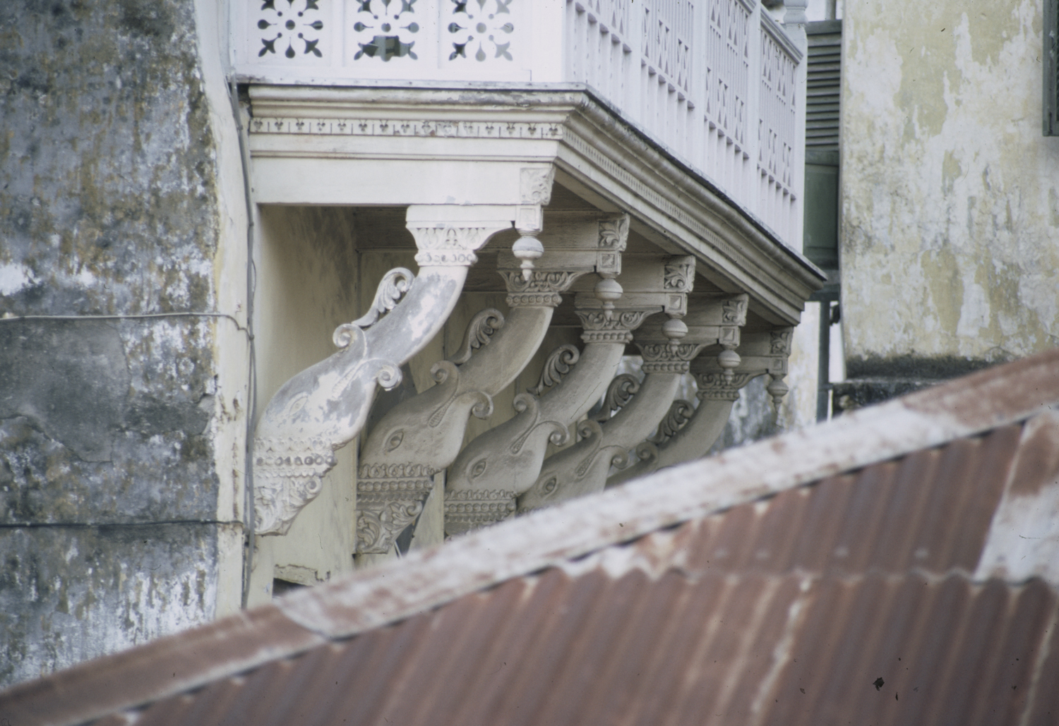 general view, detail of elephant head brackets supporting a balcony on a house, 1985