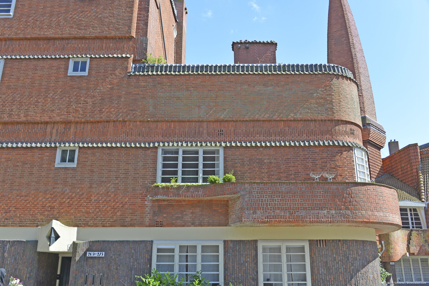 Hembrugstraat facade, northeast corner where it drops to two floors around the school courtyard; This five-storey building with 102 dwellings, a post office (2 storeys), a meeting hall for residents and the annexed school is the best example of what was termed a "worker's palace" in Amsterdam. There are 18 different floor plans for the units. In 1917 the housing association Eigen Haard commissioned de Klerk again for a block in the Spaarndammerbuurt neighborhood. A few years earlier a school had been built near the triangular site on Oostzannstraat and de Klerk was required to include it in the plan. At the apex of the triangle is the post office, resembling a huge piece of sculpture. De Klerk also designed the interior of the post office; the counters, seats and even telephone booth. At the center of the triangular block are private gardens and the school playground. It is not by chance that all the formal comparisons for the building, ranging from ship to locomotive, suggest, together with associations with movement and power, an organic entity with identifiable components. Today the Museum Het Schip is housed in the post office, with an extension in the school. Source: Casciato, Maristella, ed.; The Amsterdam School, Rotterdam: 010 Publishers, 1996 (9064502463) (accessed 6/10/2014)