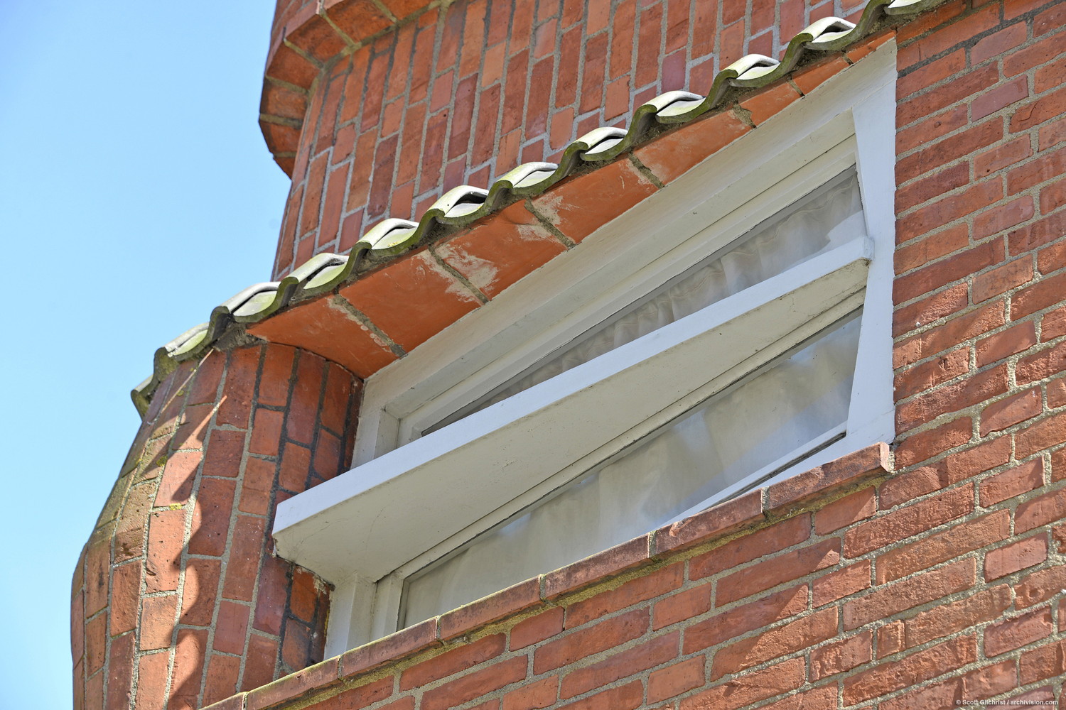 Detail of support beam for balcony on north facade; This five-storey building with 102 dwellings, a post office (2 storeys), a meeting hall for residents and the annexed school is the best example of what was termed a "worker's palace" in Amsterdam. There are 18 different floor plans for the units. In 1917 the housing association Eigen Haard commissioned de Klerk again for a block in the Spaarndammerbuurt neighborhood. A few years earlier a school had been built near the triangular site on Oostzannstraat and de Klerk was required to include it in the plan. At the apex of the triangle is the post office, resembling a huge piece of sculpture. De Klerk also designed the interior of the post office; the counters, seats and even telephone booth. At the center of the triangular block are private gardens and the school playground. It is not by chance that all the formal comparisons for the building, ranging from ship to locomotive, suggest, together with associations with movement and power, an organic entity with identifiable components. Today the Museum Het Schip is housed in the post office, with an extension in the school. Source: Casciato, Maristella, ed.; The Amsterdam School, Rotterdam: 010 Publishers, 1996 (9064502463) (accessed 6/10/2014)