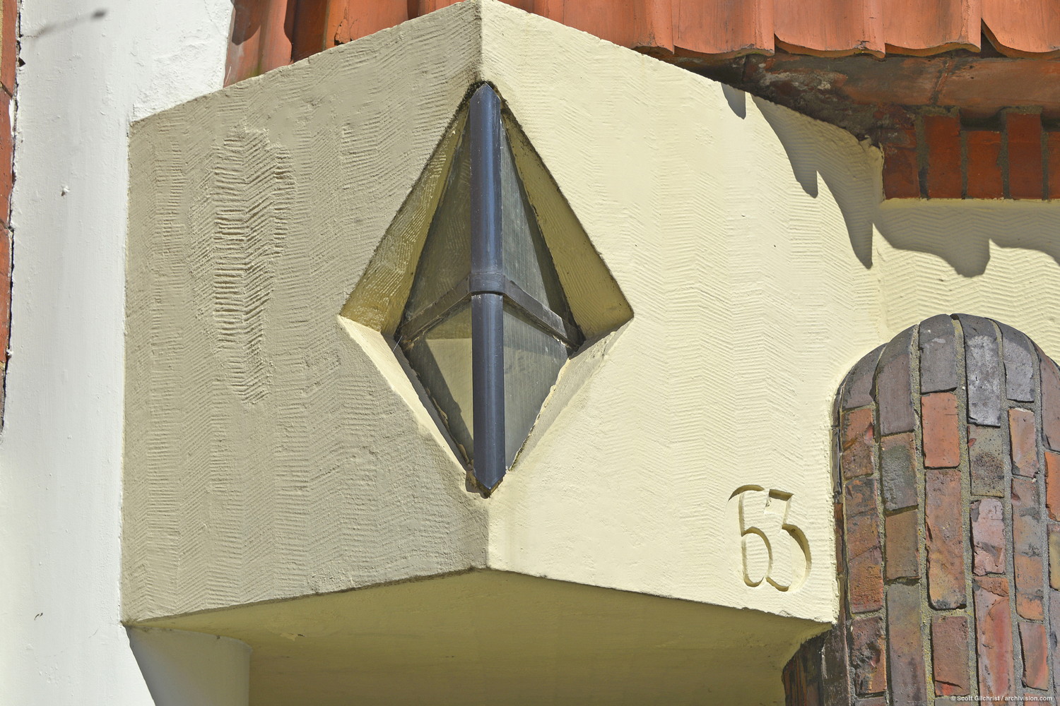 Detail of support beam for balcony on north facade; This five-storey building with 102 dwellings, a post office (2 storeys), a meeting hall for residents and the annexed school is the best example of what was termed a "worker's palace" in Amsterdam. There are 18 different floor plans for the units. In 1917 the housing association Eigen Haard commissioned de Klerk again for a block in the Spaarndammerbuurt neighborhood. A few years earlier a school had been built near the triangular site on Oostzannstraat and de Klerk was required to include it in the plan. At the apex of the triangle is the post office, resembling a huge piece of sculpture. De Klerk also designed the interior of the post office; the counters, seats and even telephone booth. At the center of the triangular block are private gardens and the school playground. It is not by chance that all the formal comparisons for the building, ranging from ship to locomotive, suggest, together with associations with movement and power, an organic entity with identifiable components. Today the Museum Het Schip is housed in the post office, with an extension in the school. Source: Casciato, Maristella, ed.; The Amsterdam School, Rotterdam: 010 Publishers, 1996 (9064502463) (accessed 6/10/2014)