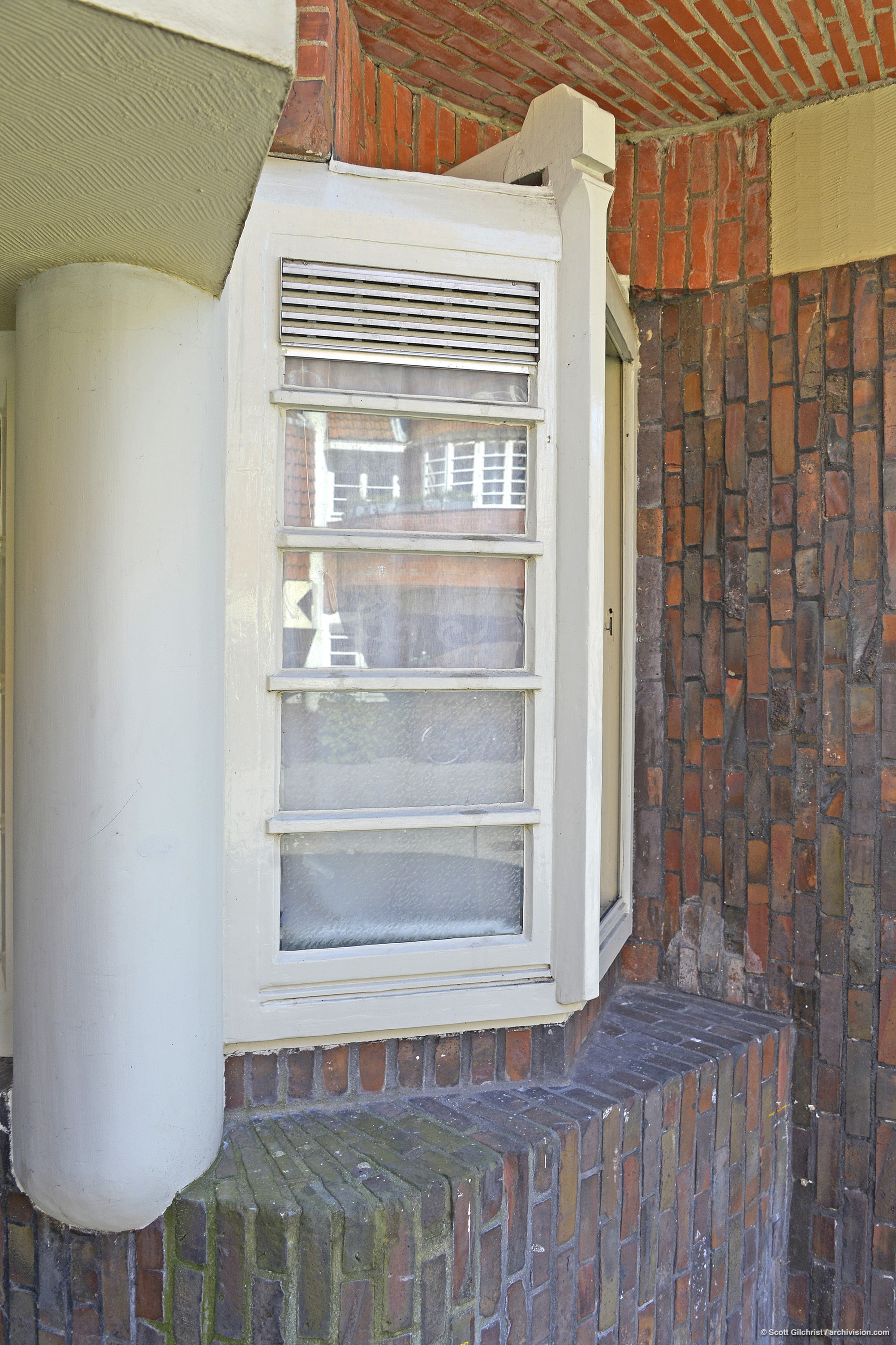 Detail of support beam for balcony on north facade; This five-storey building with 102 dwellings, a post office (2 storeys), a meeting hall for residents and the annexed school is the best example of what was termed a "worker's palace" in Amsterdam. There are 18 different floor plans for the units. In 1917 the housing association Eigen Haard commissioned de Klerk again for a block in the Spaarndammerbuurt neighborhood. A few years earlier a school had been built near the triangular site on Oostzannstraat and de Klerk was required to include it in the plan. At the apex of the triangle is the post office, resembling a huge piece of sculpture. De Klerk also designed the interior of the post office; the counters, seats and even telephone booth. At the center of the triangular block are private gardens and the school playground. It is not by chance that all the formal comparisons for the building, ranging from ship to locomotive, suggest, together with associations with movement and power, an organic entity with identifiable components. Today the Museum Het Schip is housed in the post office, with an extension in the school. Source: Casciato, Maristella, ed.; The Amsterdam School, Rotterdam: 010 Publishers, 1996 (9064502463) (accessed 6/10/2014)