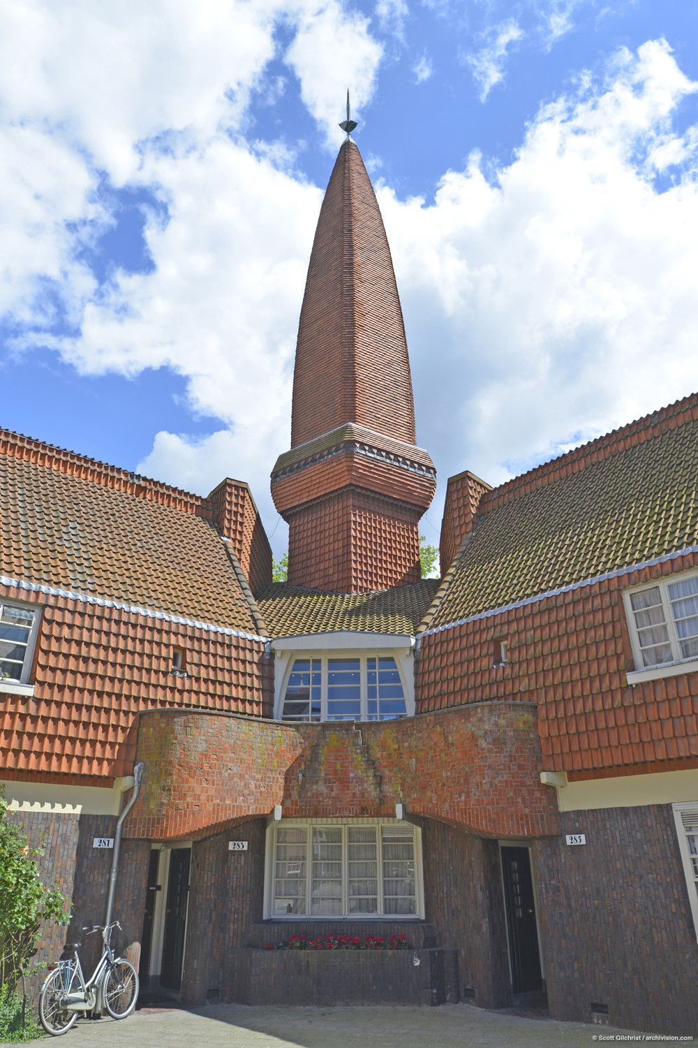Hembrugstraat facade, inset courtyard, steeple tower at center; This five-storey building with 102 dwellings, a post office (2 storeys), a meeting hall for residents and the annexed school is the best example of what was termed a "worker's palace" in Amsterdam. There are 18 different floor plans for the units. In 1917 the housing association Eigen Haard commissioned de Klerk again for a block in the Spaarndammerbuurt neighborhood. A few years earlier a school had been built near the triangular site on Oostzannstraat and de Klerk was required to include it in the plan. At the apex of the triangle is the post office, resembling a huge piece of sculpture. De Klerk also designed the interior of the post office; the counters, seats and even telephone booth. At the center of the triangular block are private gardens and the school playground. It is not by chance that all the formal comparisons for the building, ranging from ship to locomotive, suggest, together with associations with movement and power, an organic entity with identifiable components. Today the Museum Het Schip is housed in the post office, with an extension in the school. Source: Casciato, Maristella, ed.; The Amsterdam School, Rotterdam: 010 Publishers, 1996 (9064502463) (accessed 6/10/2014)