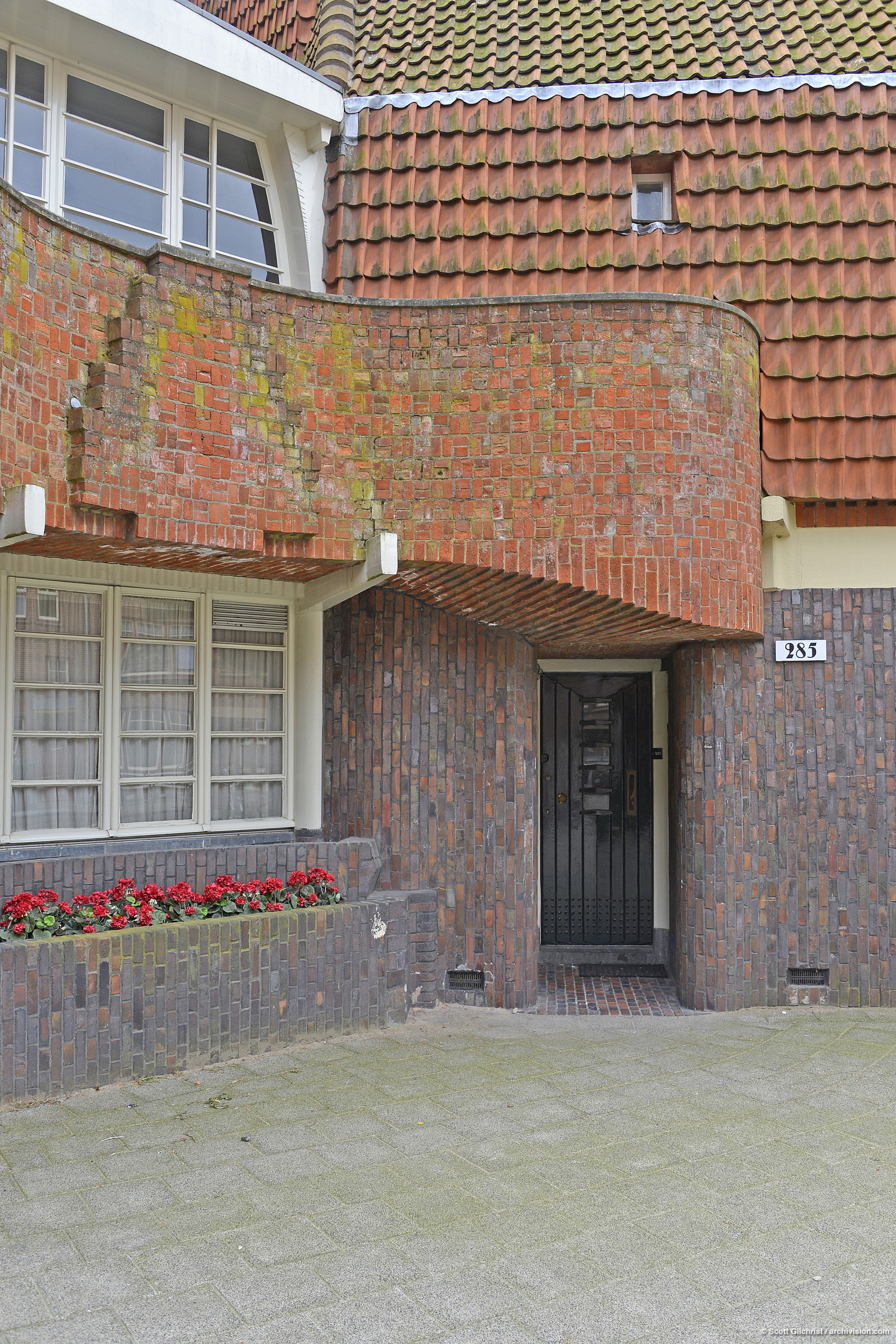 Hembrugstraat facade, curving brick balcony on two-storey courtyard housing; This five-storey building with 102 dwellings, a post office (2 storeys), a meeting hall for residents and the annexed school is the best example of what was termed a "worker's palace" in Amsterdam. There are 18 different floor plans for the units. In 1917 the housing association Eigen Haard commissioned de Klerk again for a block in the Spaarndammerbuurt neighborhood. A few years earlier a school had been built near the triangular site on Oostzannstraat and de Klerk was required to include it in the plan. At the apex of the triangle is the post office, resembling a huge piece of sculpture. De Klerk also designed the interior of the post office; the counters, seats and even telephone booth. At the center of the triangular block are private gardens and the school playground. It is not by chance that all the formal comparisons for the building, ranging from ship to locomotive, suggest, together with associations with movement and power, an organic entity with identifiable components. Today the Museum Het Schip is housed in the post office, with an extension in the school. Source: Casciato, Maristella, ed.; The Amsterdam School, Rotterdam: 010 Publishers, 1996 (9064502463) (accessed 6/10/2014)