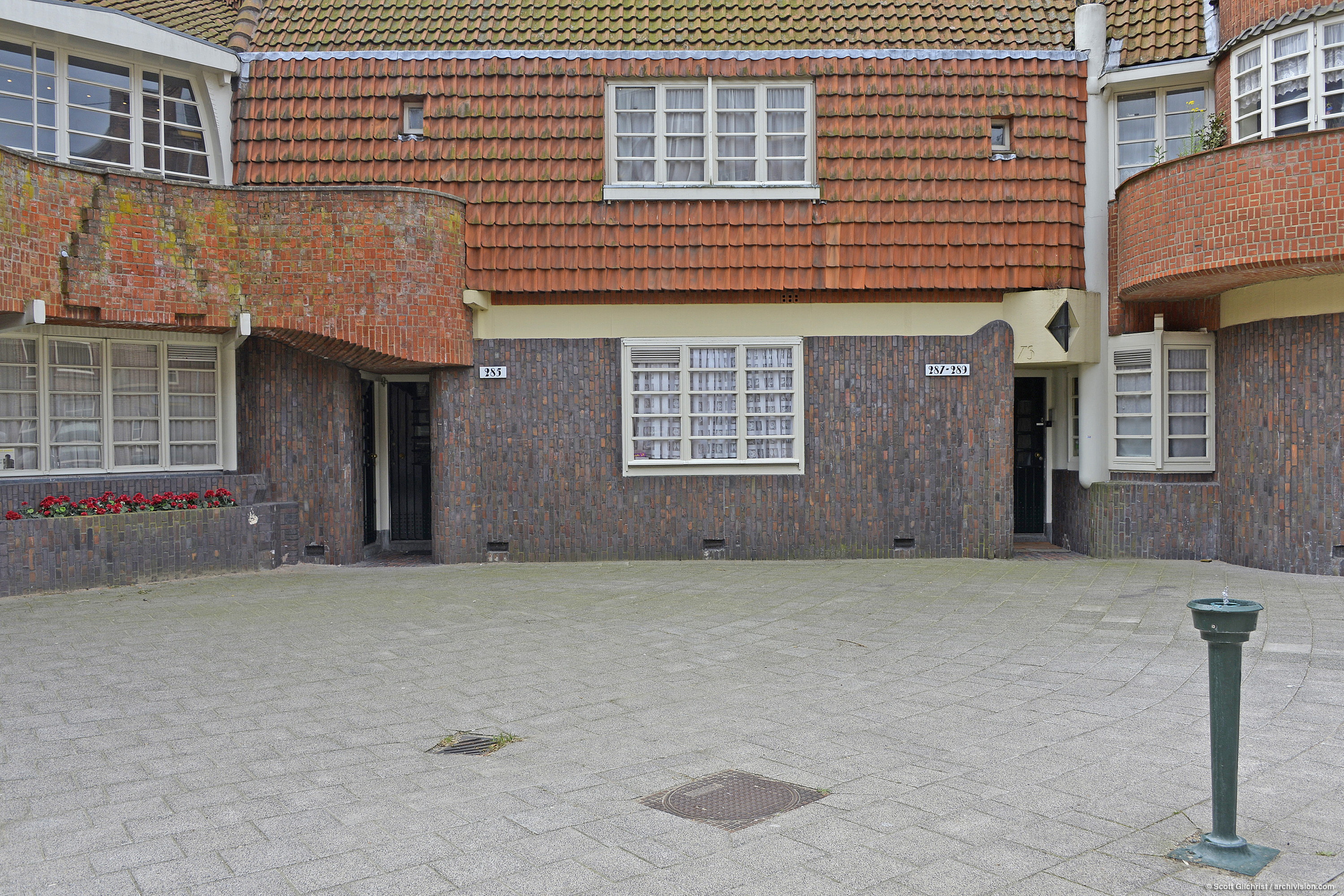 Hembrugstraat facade, inset triangular courtyard with 2-storey housing; This five-storey building with 102 dwellings, a post office (2 storeys), a meeting hall for residents and the annexed school is the best example of what was termed a "worker's palace" in Amsterdam. There are 18 different floor plans for the units. In 1917 the housing association Eigen Haard commissioned de Klerk again for a block in the Spaarndammerbuurt neighborhood. A few years earlier a school had been built near the triangular site on Oostzannstraat and de Klerk was required to include it in the plan. At the apex of the triangle is the post office, resembling a huge piece of sculpture. De Klerk also designed the interior of the post office; the counters, seats and even telephone booth. At the center of the triangular block are private gardens and the school playground. It is not by chance that all the formal comparisons for the building, ranging from ship to locomotive, suggest, together with associations with movement and power, an organic entity with identifiable components. Today the Museum Het Schip is housed in the post office, with an extension in the school. Source: Casciato, Maristella, ed.; The Amsterdam School, Rotterdam: 010 Publishers, 1996 (9064502463) (accessed 6/10/2014)