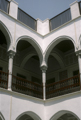 exterior, courtyard, detail of upper level northeast corner, August 1994