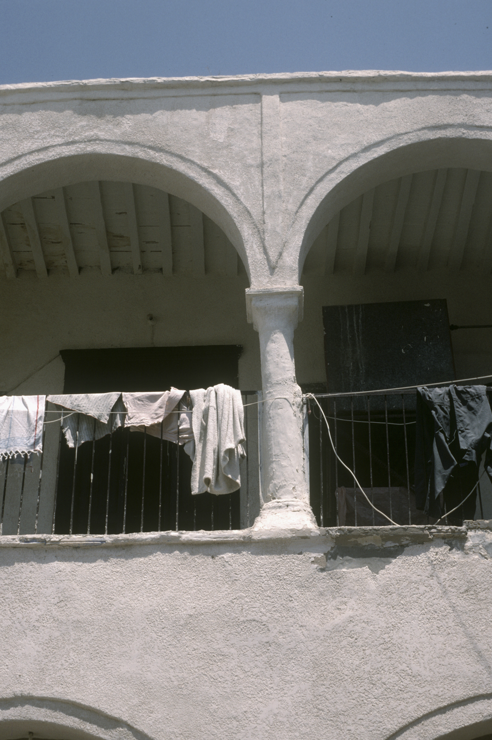 detail, house on Gos al-Mifti Lane in the medina, detail of a column in the second level of the courtyard, August 1994