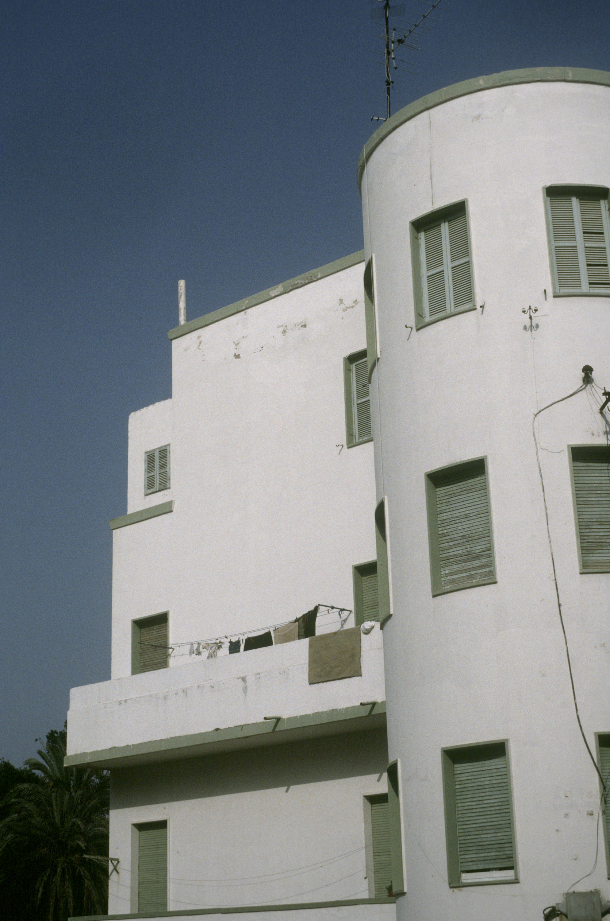 exterior, detail of a corner building, with a rounded corner tower, August 1994