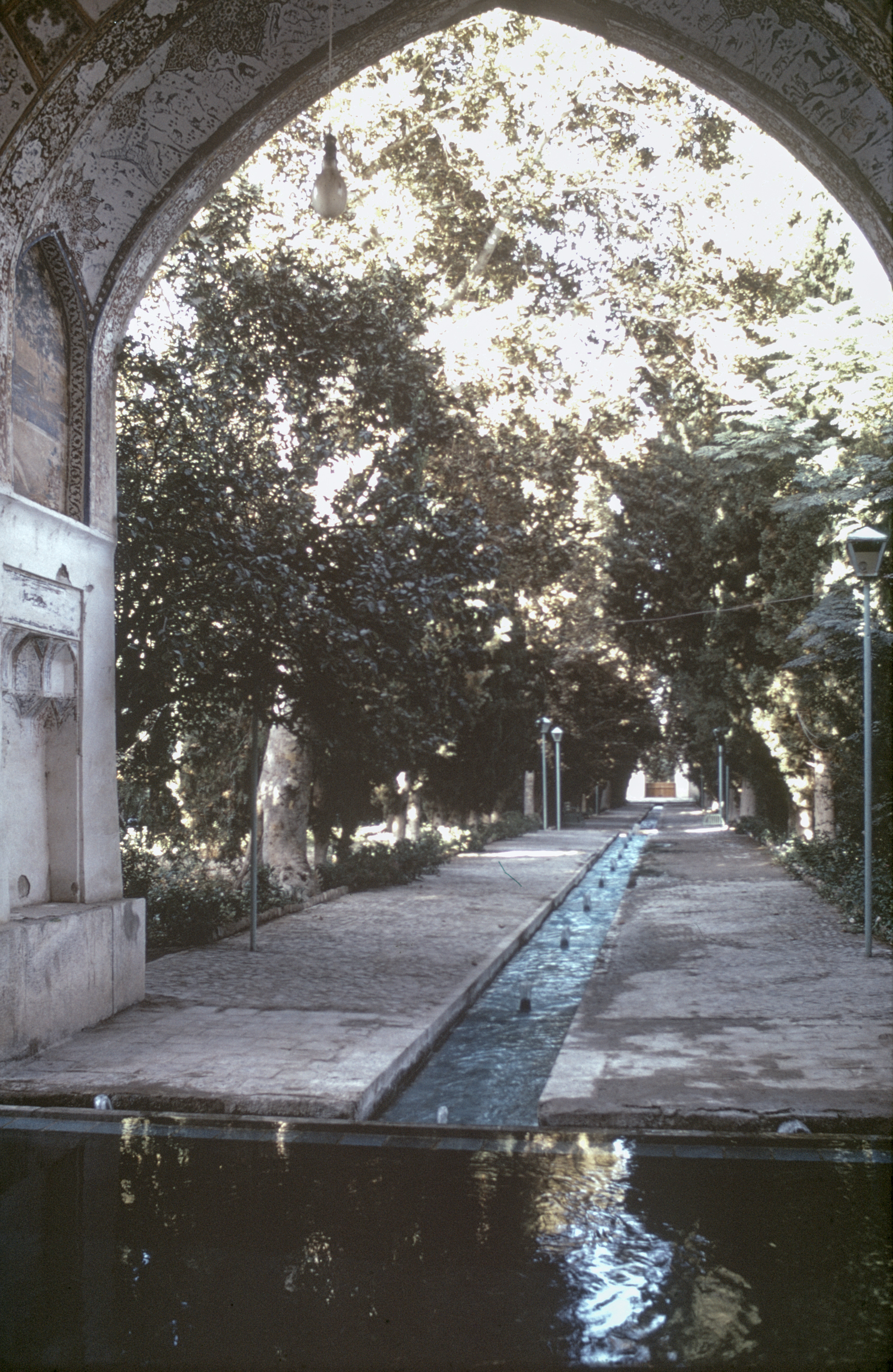general view, view from the Fath Ali Shah pavilion along a water channel, ca. 1974