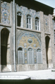 exterior, facade detail, 1980 or earlier "As other important centres in the area declined, the city developed to become particularly prominent under the patronage of the Qajar dynasty (reg 1779–1924; see Islamic art, §II, 7(ii)(b)). Agha Muhammad (reg 1779–97) selected the citadel for his palace and administrative centre, and Fath 'Ali Shah (reg 1797–1834) completed the Gulistan Palace. The only buildings that remain from this sprawling complex with luxuriant gardens set with pools and pavilions are the Takht-i Marmar, a columnar audience hall, and the 'Imarat-i Badgir on the north and south sides...In 1870–72 the city was enlarged and rebuilt by Nasir al-Din (reg 1848–96)...At the centre of the new city stood the Gulistan Palace, which was also rebuilt (1867–92), maintaining the traditional segregation of public and private areas. On the east side Nasir al-Din ordered the Shams al-'Imarat, a private residence comprising a multi-storey tower with two turrets as balconies. The work was supervised by Dust 'Ali Khan Nizam al-Dawla. Fath 'Ali Shah’s taste for painted decoration was replaced by Nasir al-Din’s for polychrome tilework, ornately carved stucco and mirror-glass. Nasir al-Din then turned to the north side of the palace, replacing Fath 'Ali Shah’s buildings with a spacious series of rooms (1873–82), including a stair decorated with mirrors, a tiled vestibule, an audience hall and other reception areas. The rooms were linked behind an impressive double-storey façade that combined such European features as tall windows and semi-engaged Classical columns with tilework decoration. The Naranjistan (Orangery) Palace was built and the retaining walls of the compound tiled. New women’s quarters (Pers. andarun; destr.) were built behind the audience hall, and the small Kakh-i Abyad (White palace), a two-storey rectangular building that has been converted into the Ethnographic Museum, added on the south side near the entrance to the palace gardens.