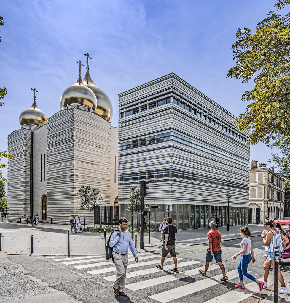 exterior, Holy Trinity Cathedral, on left, cultural center, on right, 2017 1 Quai Branly, 75007 Paris, France