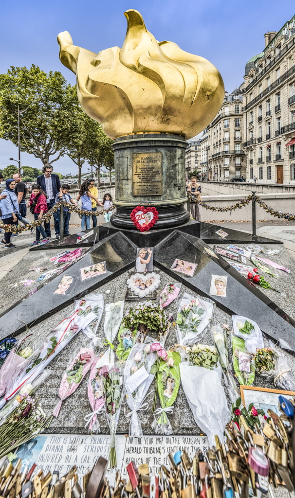 general view, the sculpture is a full-sized gold-leaf-covered replica of the torch of the Statue of Liberty donated to Paris by the International Herald Tribune on the 100 year anniversary of the publication of the English-language paper in Paris. It also is an unofficial memorial to Princess Diana after her death in 1997., 2017