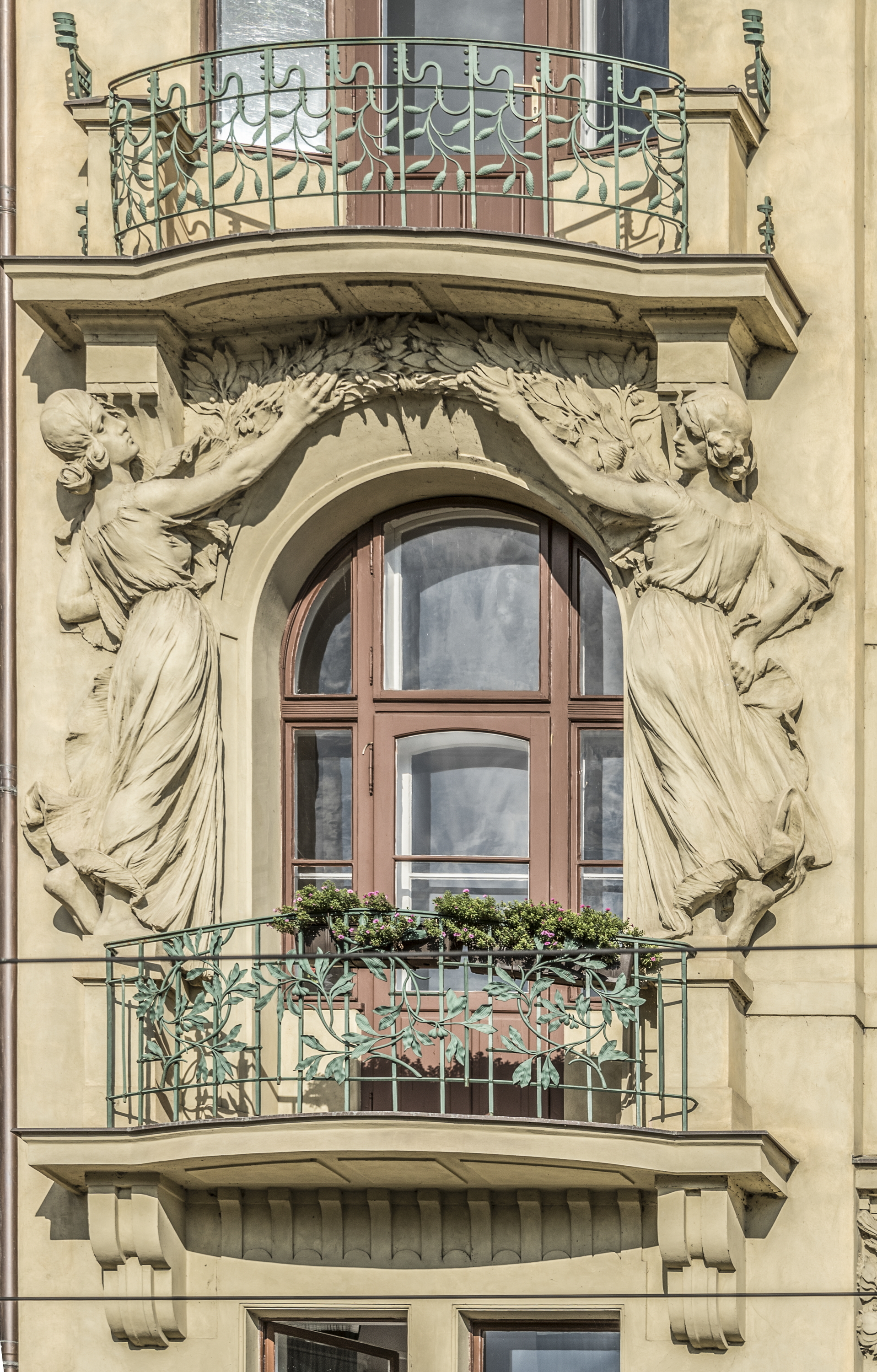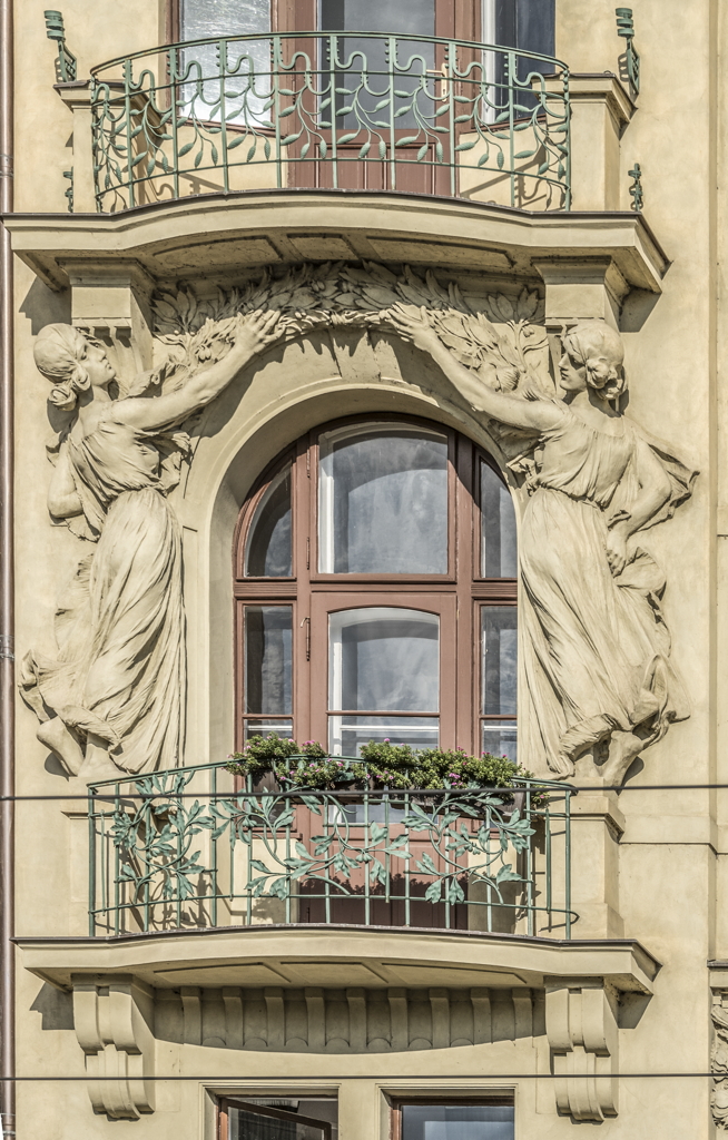 exterior, Josef Pekárek's stucco allegorical figures around a window supporting a balcony, 2017 Masarykovo nábř. 248/16, 110 00 Nové Město, Prague, Czech Republic