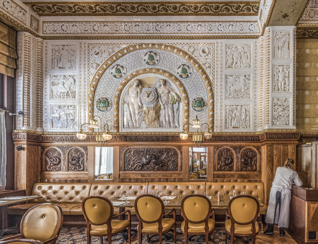 interior, ceramic mosaic wall decoration by the RAKO factory in the dining room, the Cafe Imperial, 2017 Na Poříčí 15, Prague, Czech Republic
