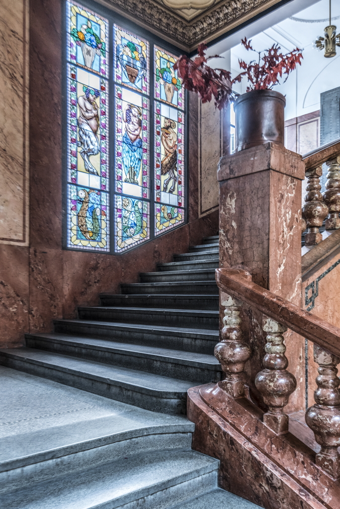 interior, stairs with stained glass windows, 2017 Štěpánská 61, 116 02 Nové Město, Prague, Czech Republic