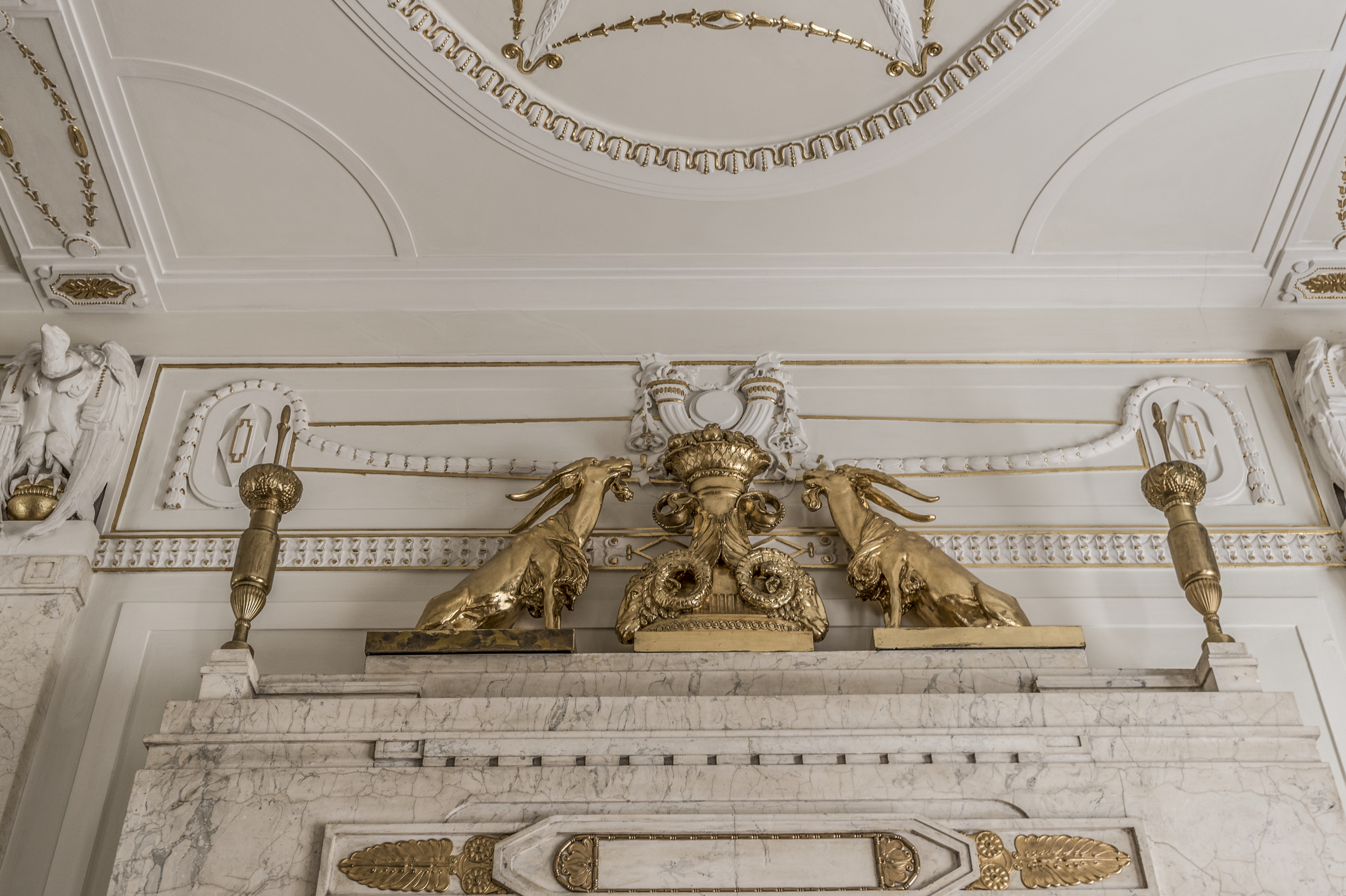 interior, gold statues on a platform over a doorway, 2017 nám. Republiky 5, 111 21 Staré Město, Prague, Czech Republic