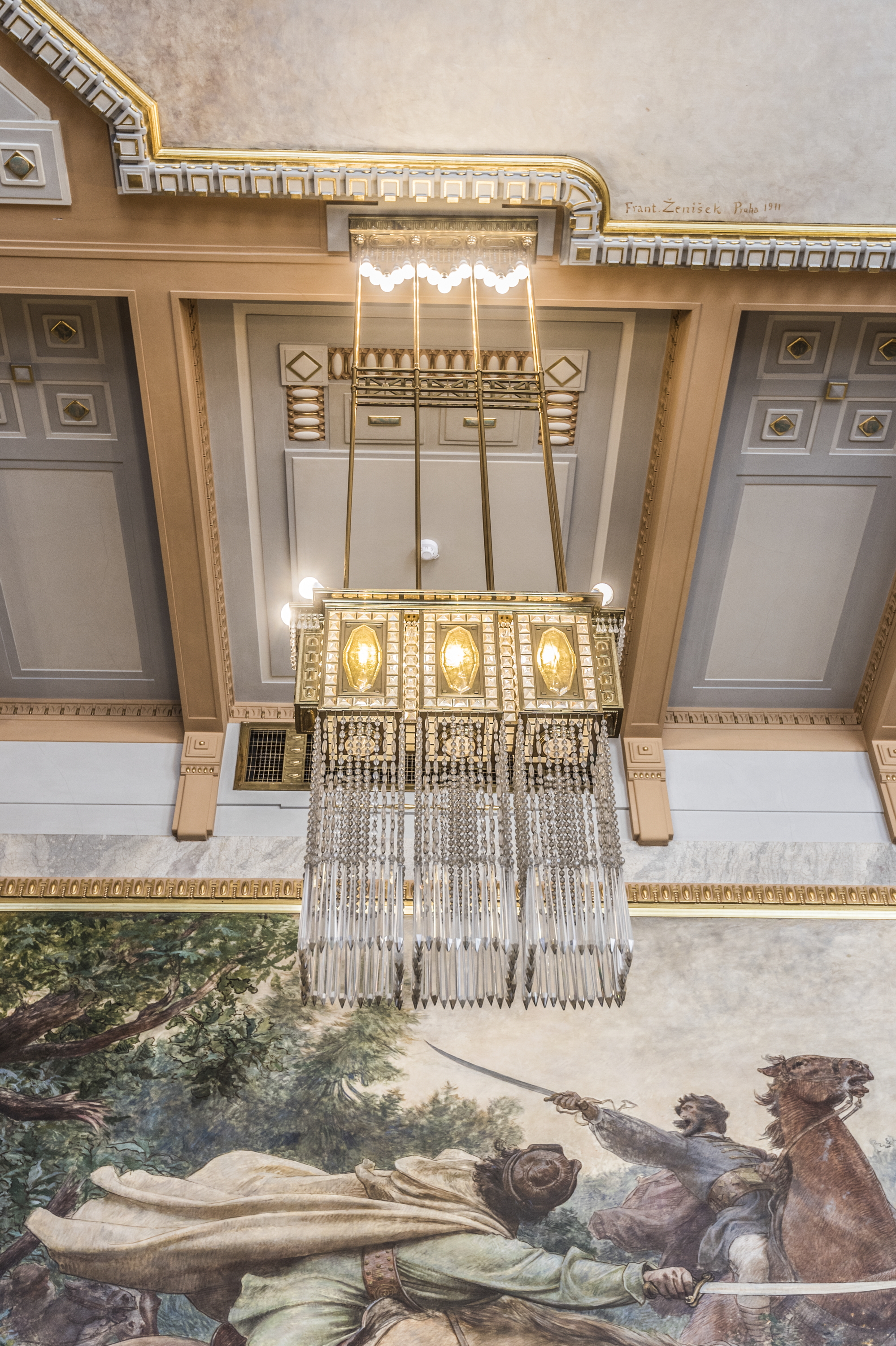 interior, chandeliers and wall painting in Palacký Hall, 2017 nám. Republiky 5, 111 21 Staré Město, Prague, Czech Republic