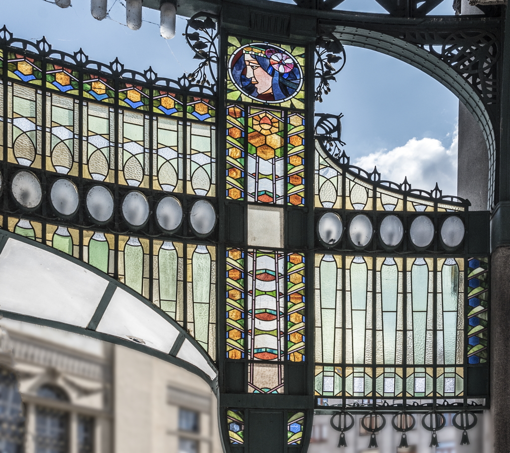 interior, stained glass and metal-work on the entrance vestibule, 2017 nám. Republiky 5, 111 21 Staré Město, Prague, Czech Republic