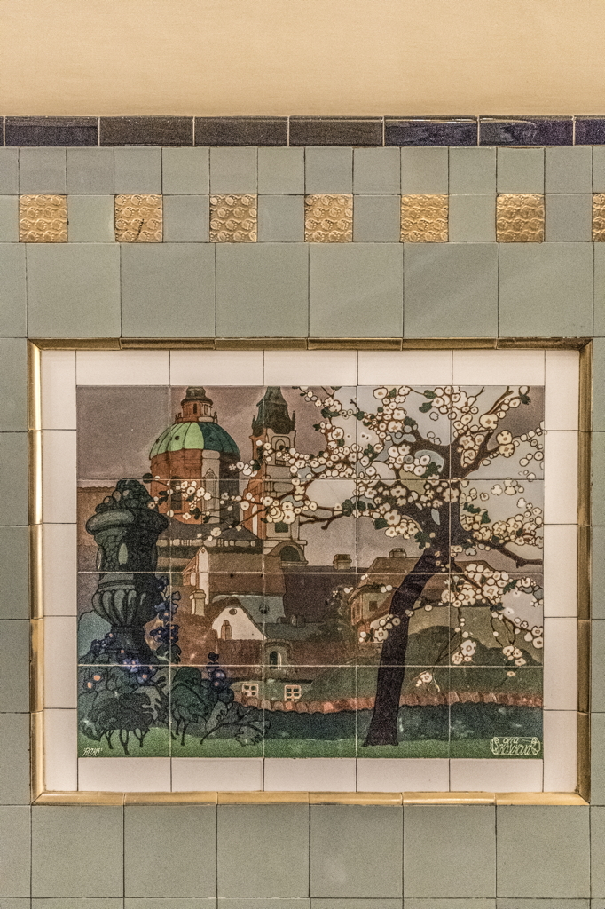 interior, wall decoration consisting of painted tiles of a city scene, 2017 nám. Republiky 5, 111 21 Staré Město, Prague, Czech Republic