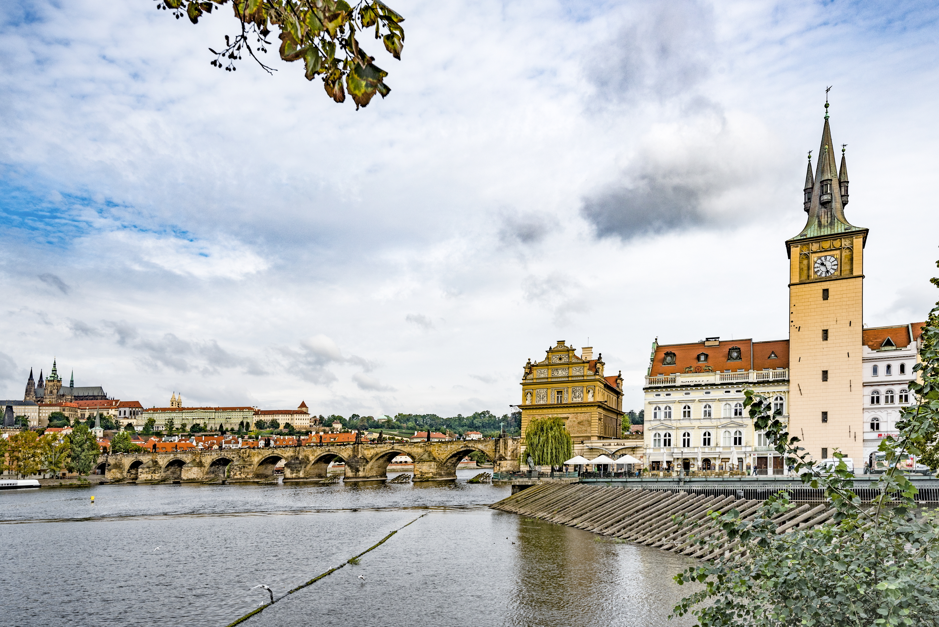 general view, view of the city from the Vltava River, Charles Bridge and the Smetana Museum, center right, 2017