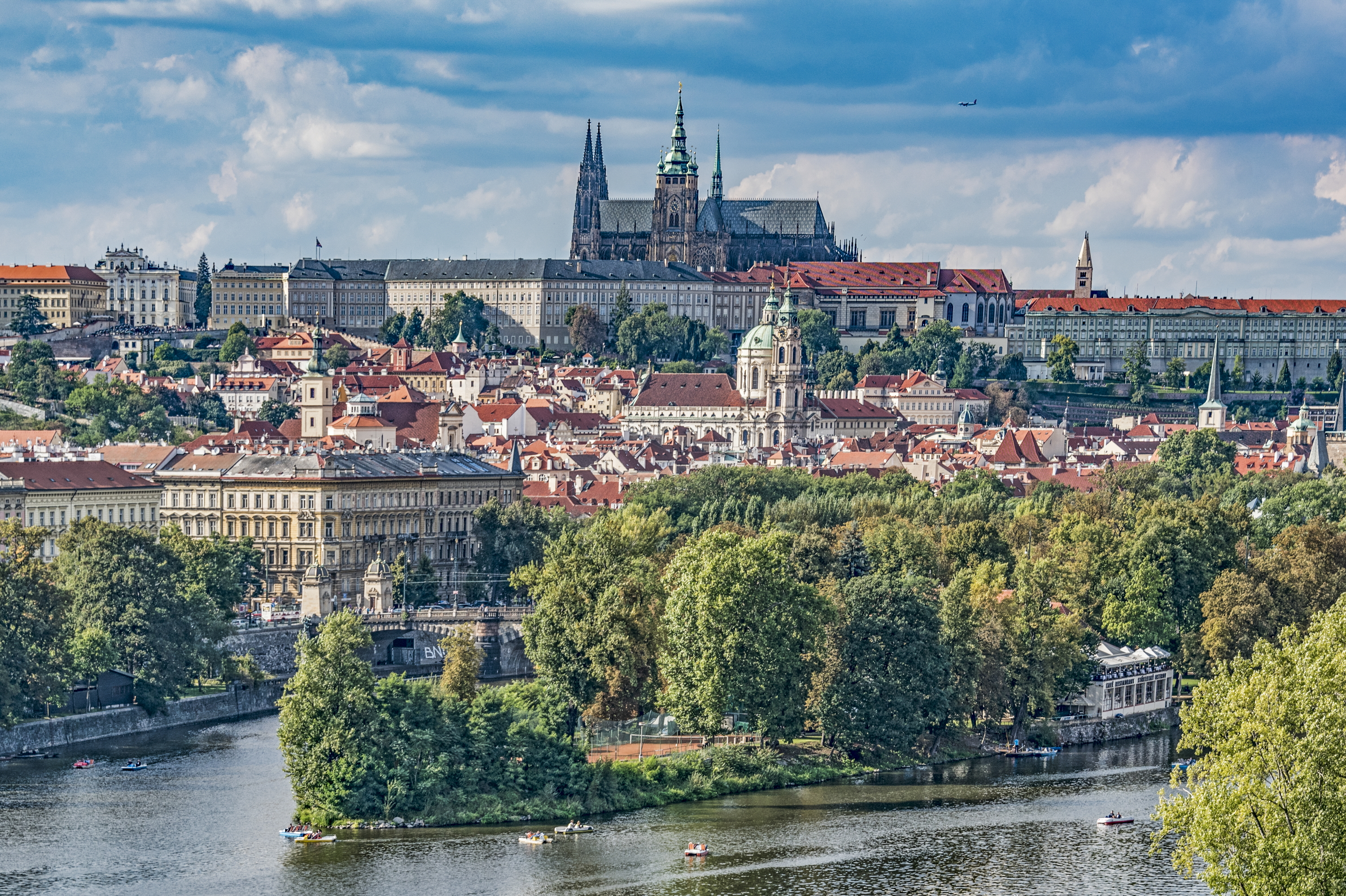 exterior, view of the city from the roof of the Dancing House, with St. Vitus Cathedral in the distance, 2017