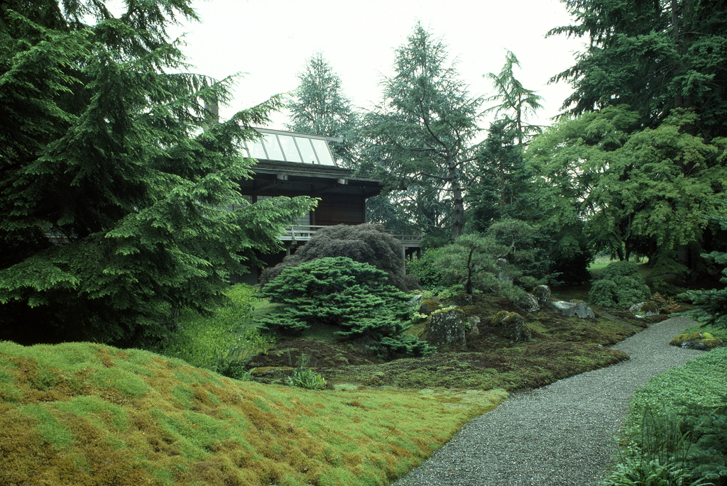 general view, Japanese Garden designed by Fujitaro Kubota; Paul Kirk's guest house, 1990